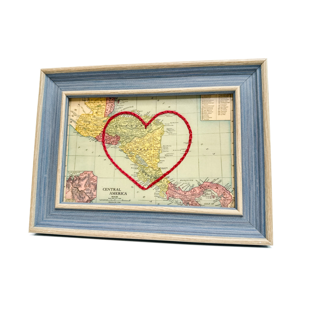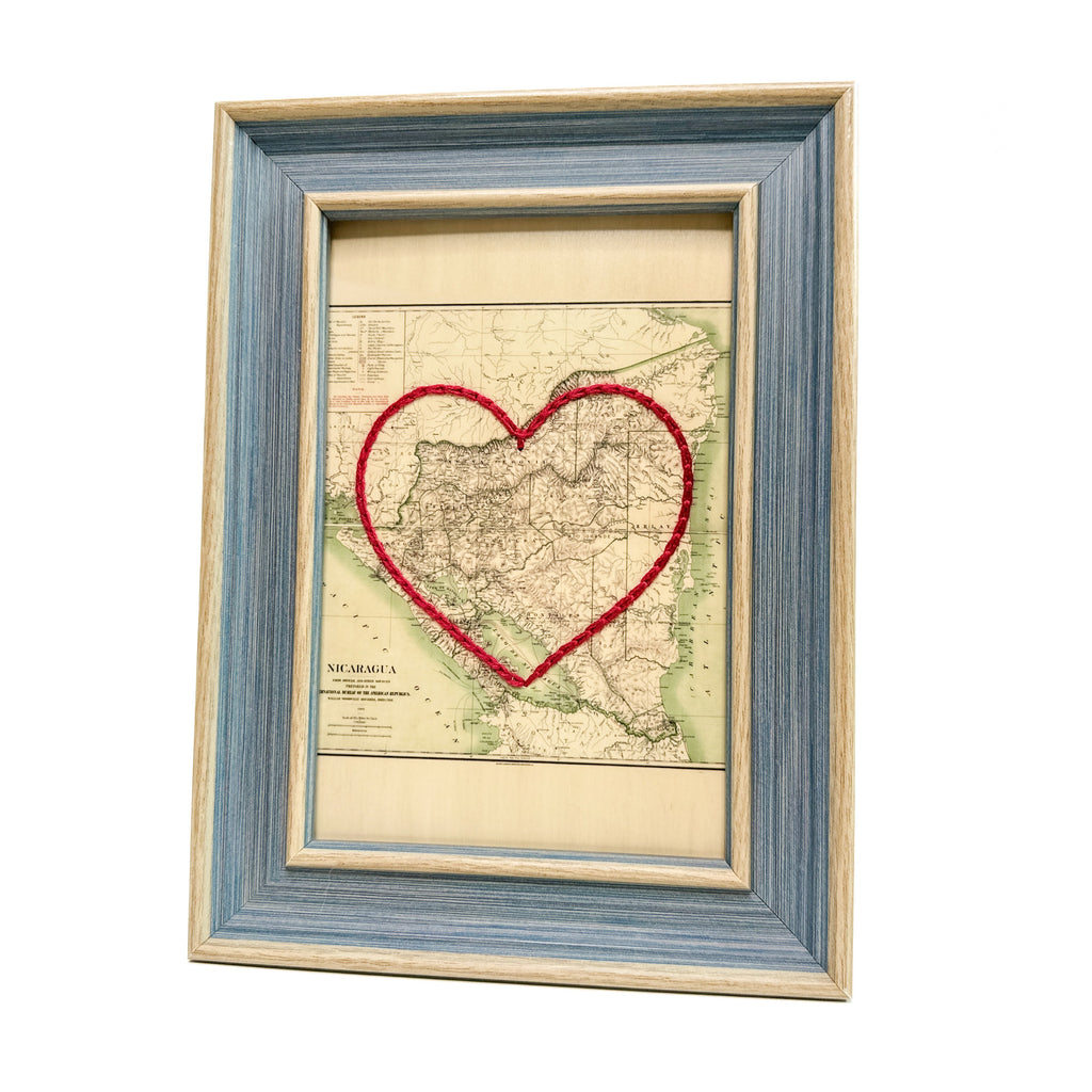 This vintage Nicaragua map print has been hand-embroidered with a red heart that symbolizes the places, people, and adventures you hold dear.