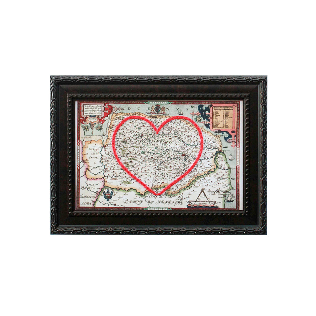 Framed and Ready to Gift: Our Norfolk, England Heart Map is framed for your convenience in a complimentary vintage-inspired frame! See product photos for options. All frames can be hung or displayed on a wall or shelf - whichever suits the owner best (except 11x14 frames - which can only be hung).
