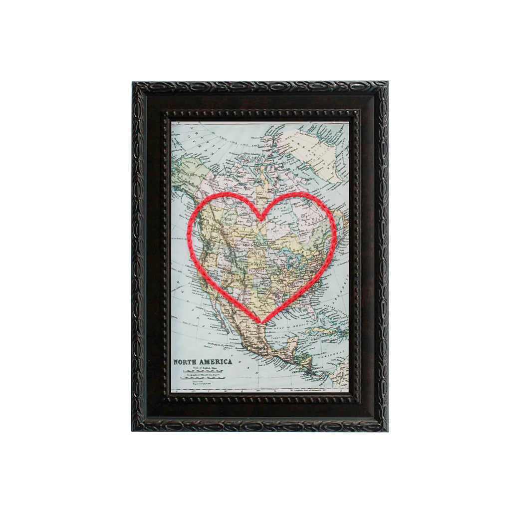 This vintage North America map print has been hand-embroidered with a red heart that symbolizes the places, people, and adventures you hold dear.