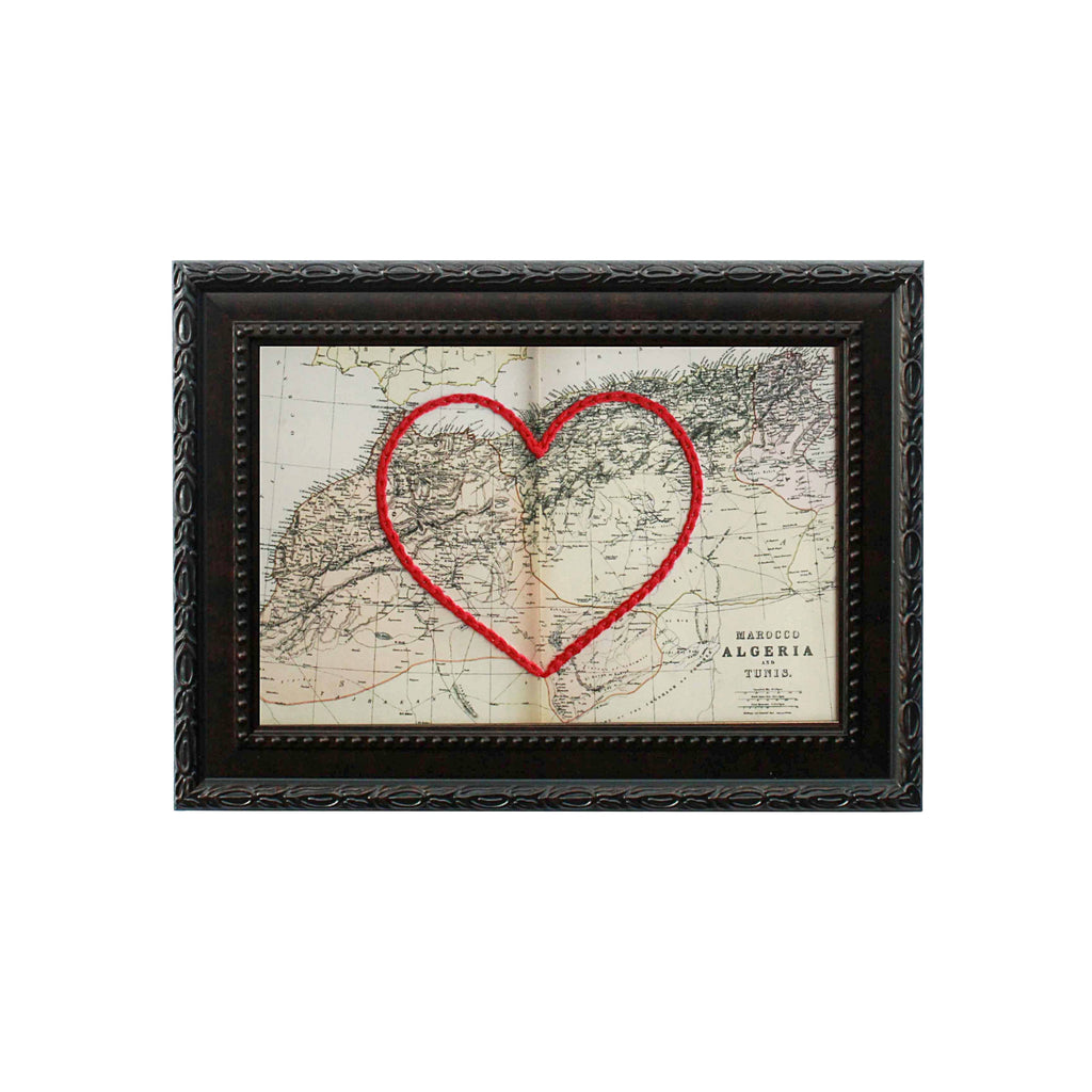 This vintage Northern Africa map print has been hand-embroidered with a red heart that symbolizes the places, people, and adventures you hold dear.