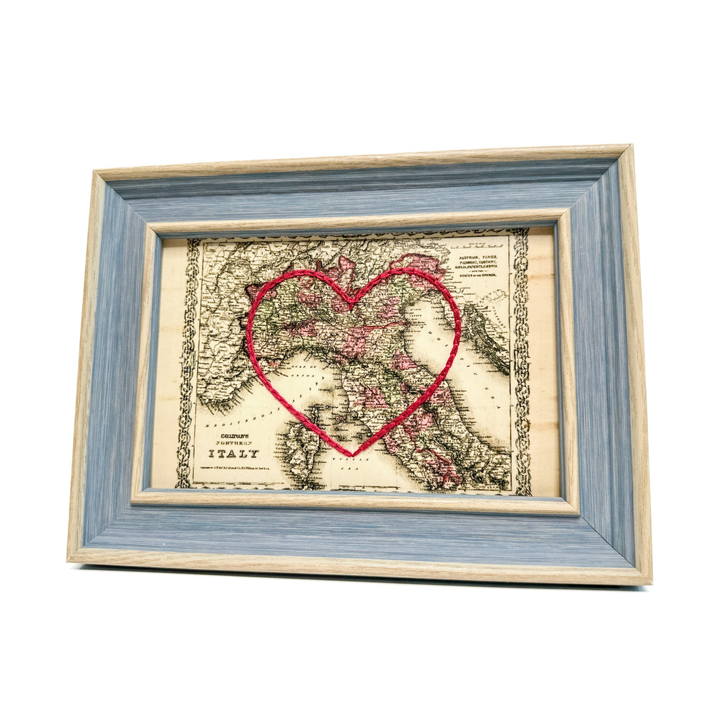 This vintage Northern Italy map print has been hand-embroidered with a red heart that symbolizes the places, people, and adventures you hold dear.