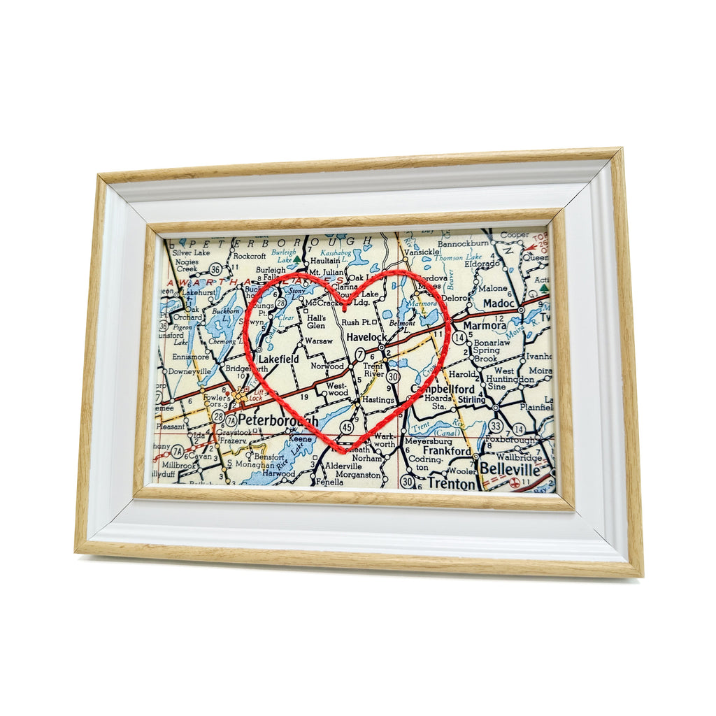This vintage Norwood, Ontario map print has been hand-embroidered with a red heart that symbolizes the places, people, and adventures you hold dear.