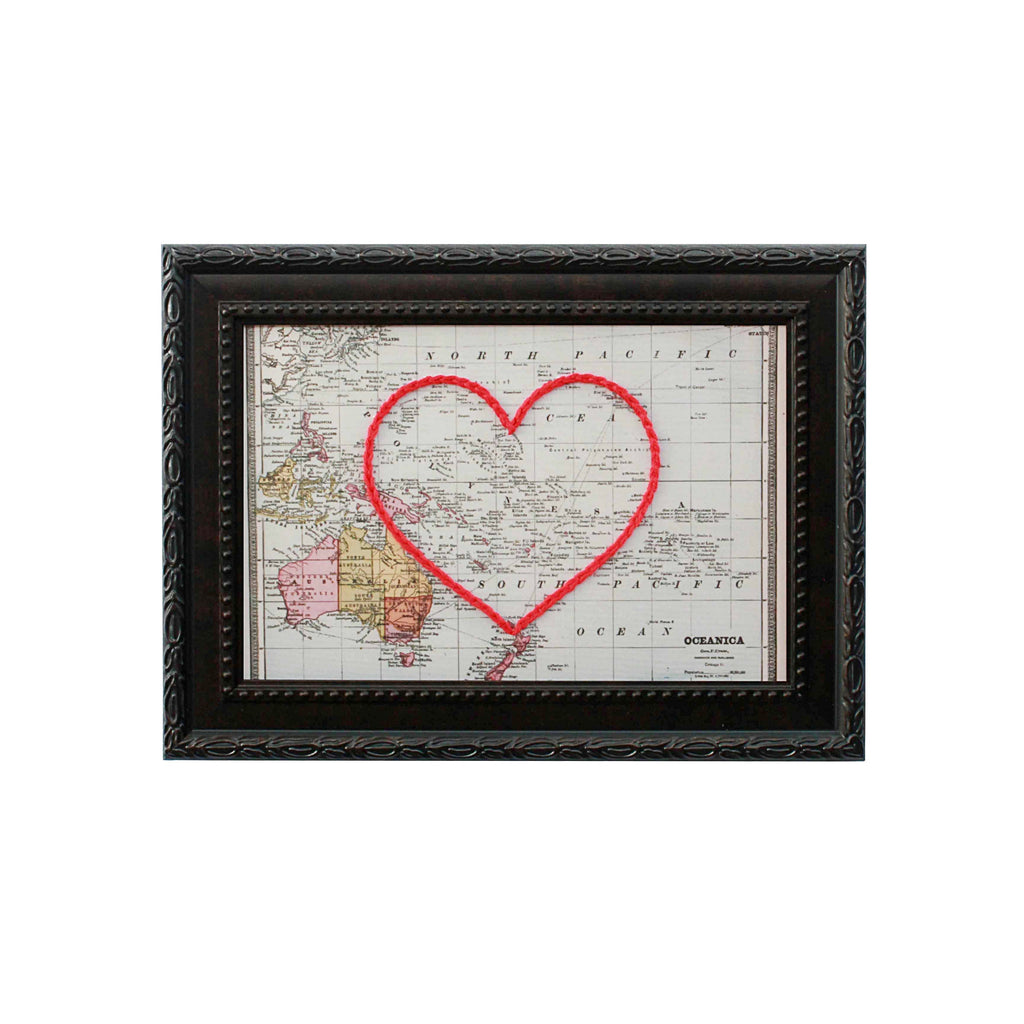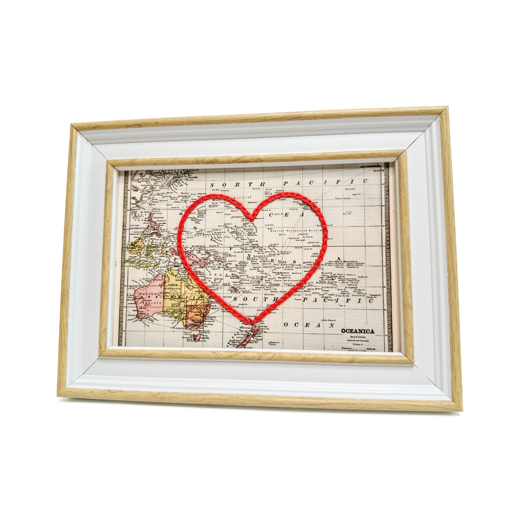 This vintage Oceanica map print has been hand-embroidered with a red heart that symbolizes the places, people, and adventures you hold dear.