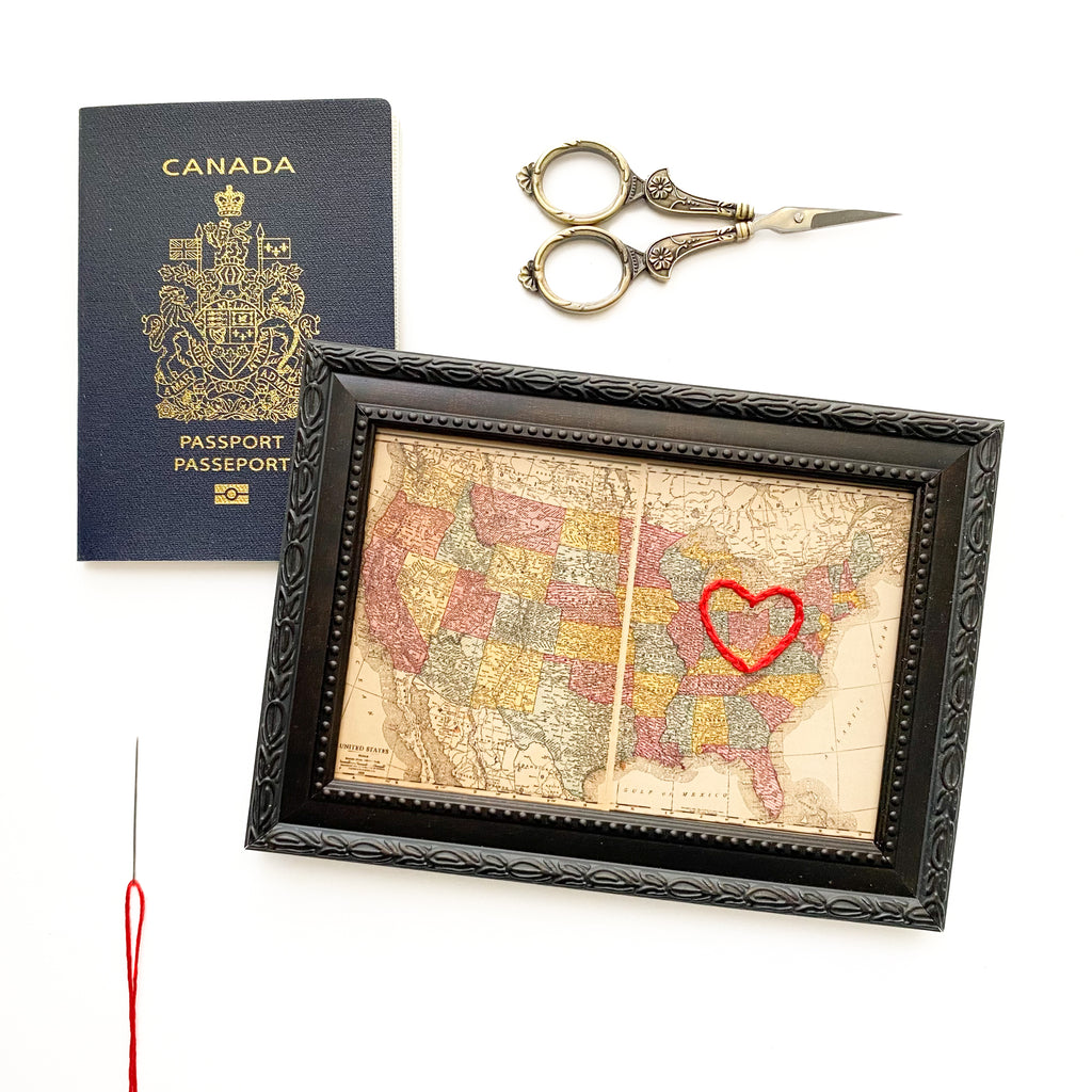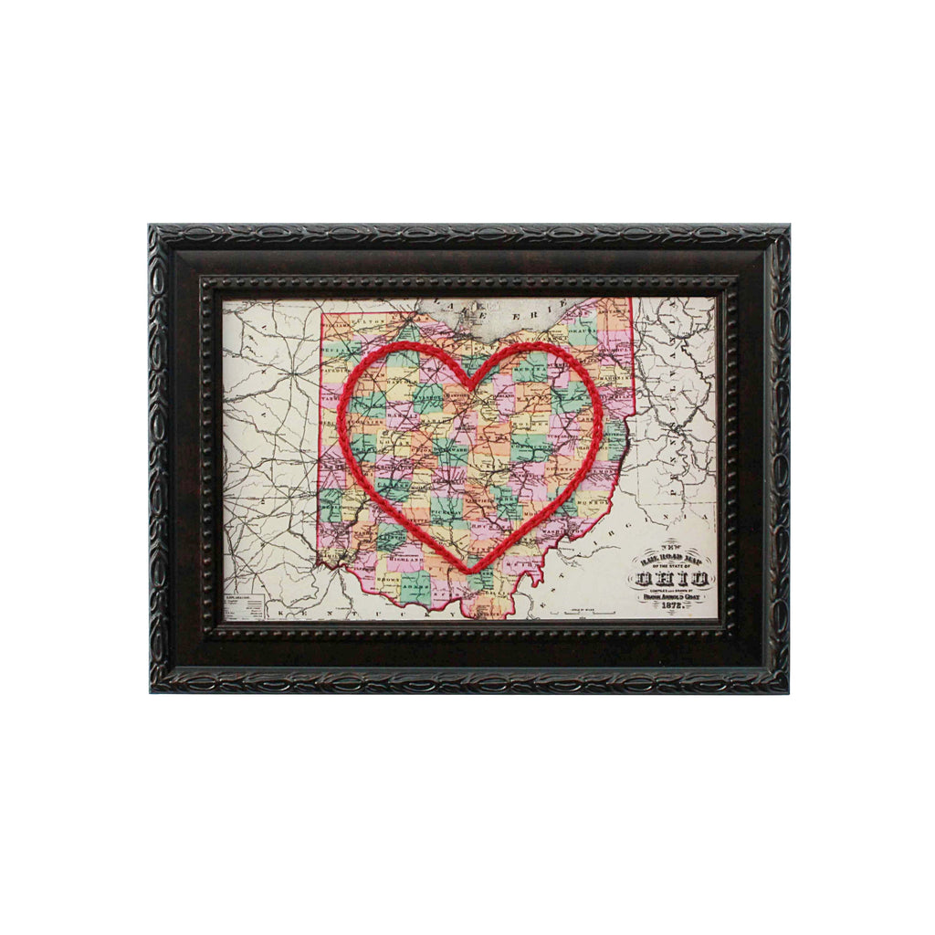 This vintage Ohio map print has been hand-embroidered with a red heart that symbolizes the places, people, and adventures you hold dear.