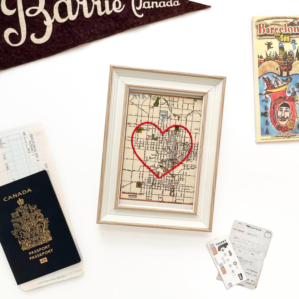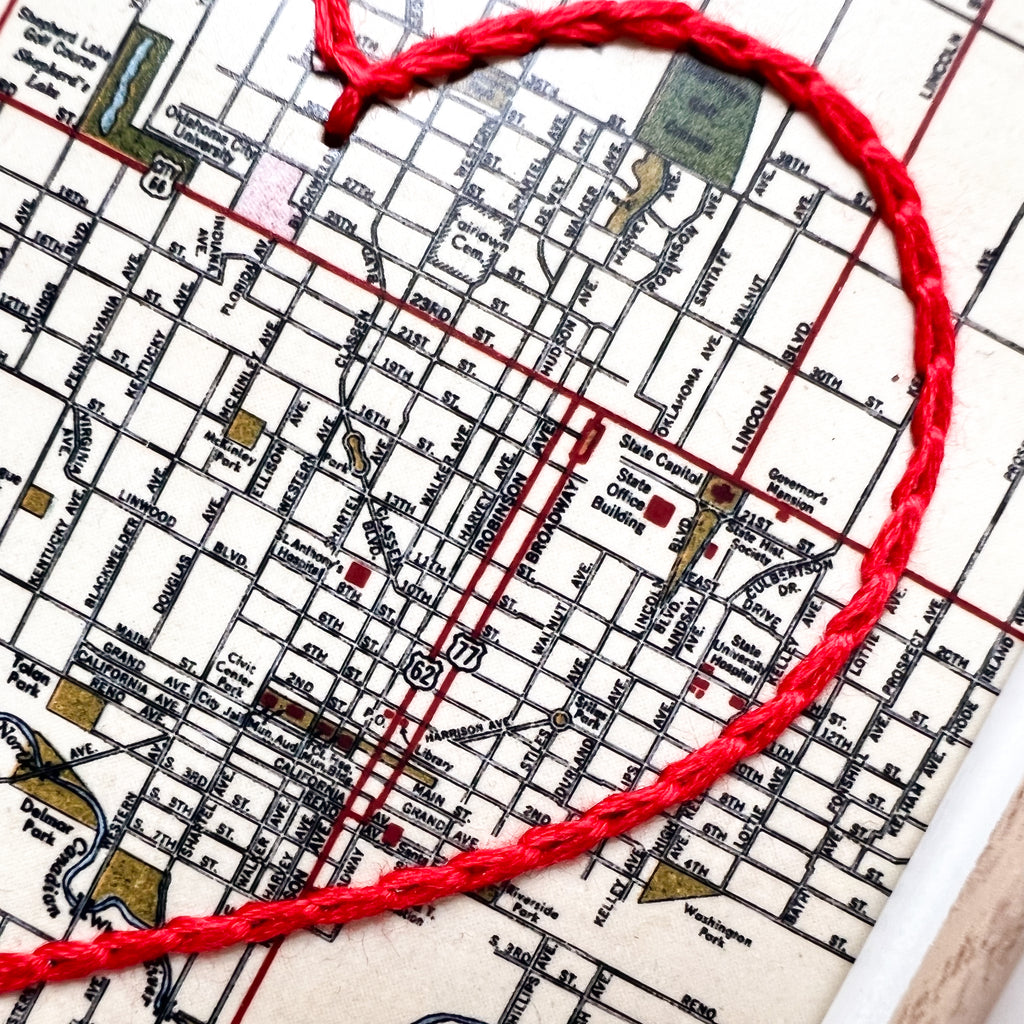 This vintage Oklahoma City, Oklahoma map print has been hand-embroidered with a red heart that symbolizes the places, people, and adventures you hold dear.