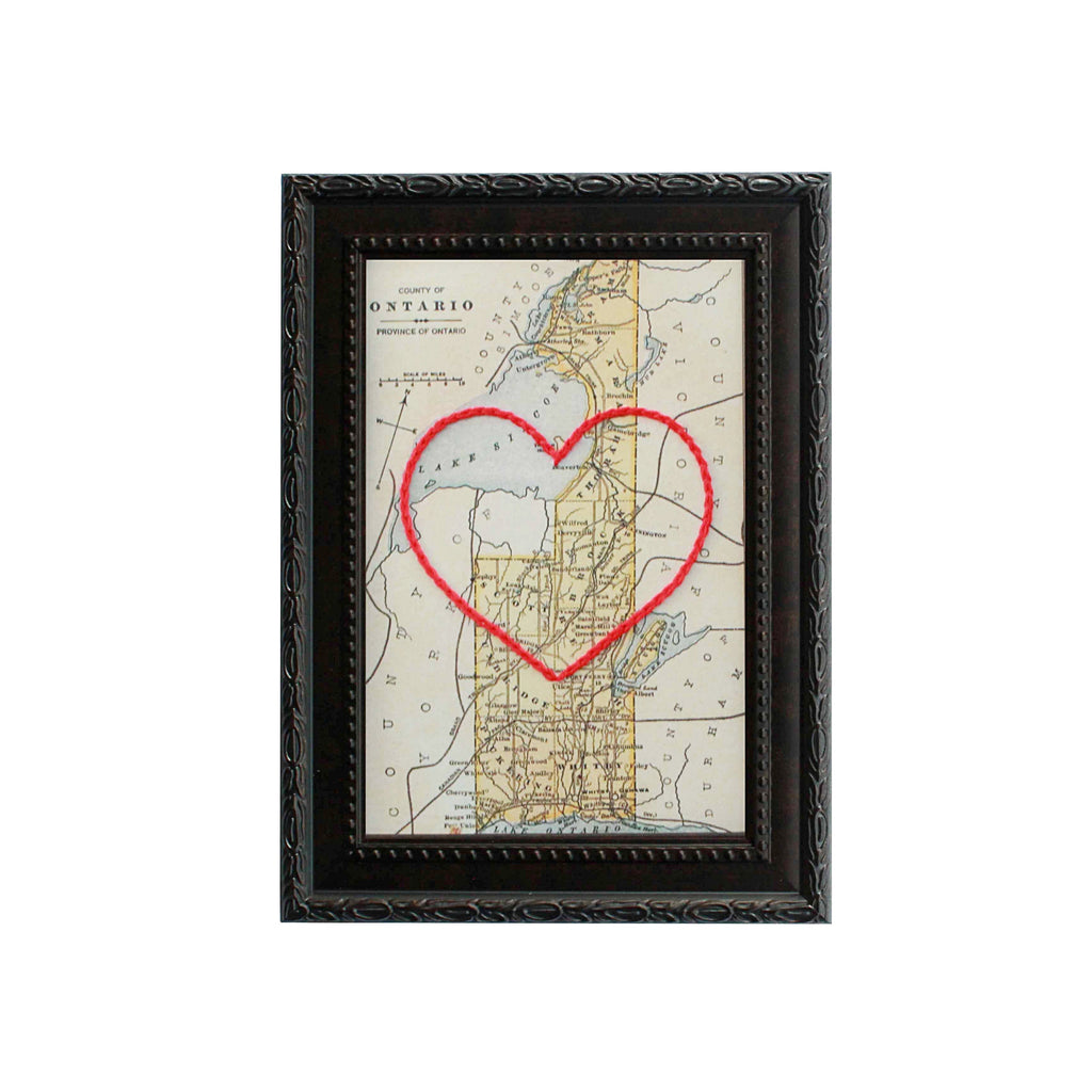 This vintage Ontario County, Ontario map print has been hand-embroidered with a red heart that symbolizes the places, people, and adventures you hold dear.
