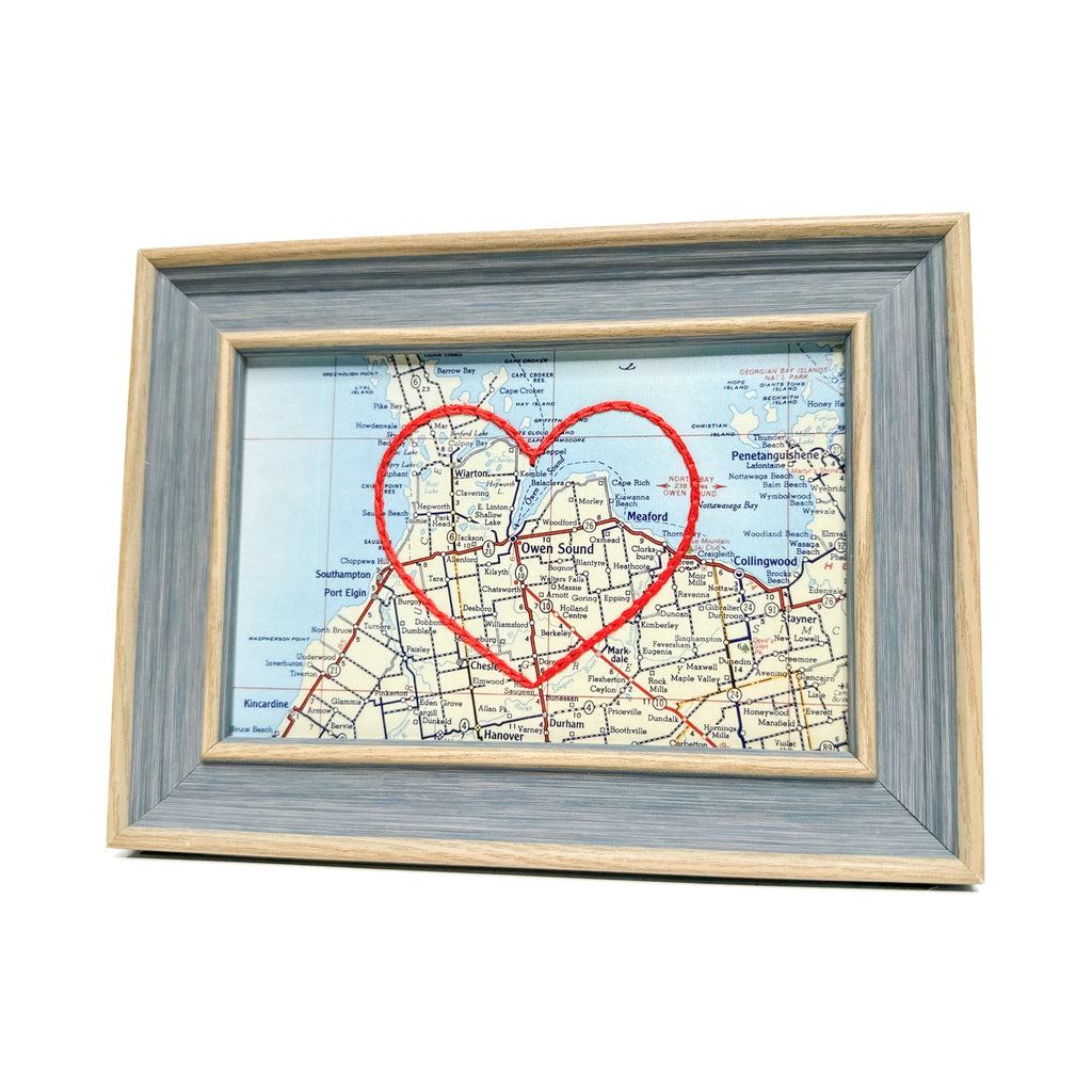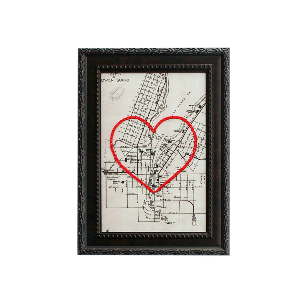 This vintage Owen Sound, Ontario map print has been hand-embroidered with a red heart that symbolizes the places, people, and adventures you hold dear.