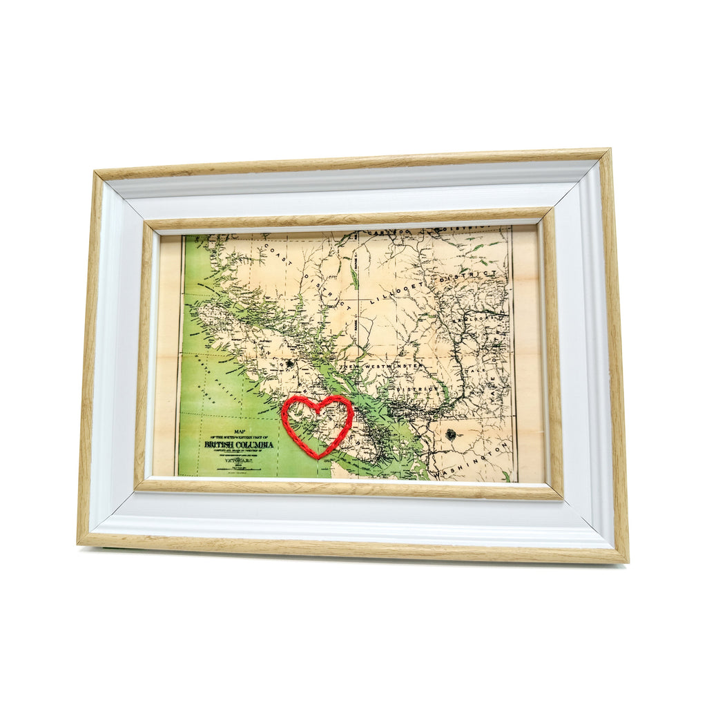 This vintage Vancouver Island map print has been hand-embroidered with a red heart around Pacific Rim National Park Reserve - symbolizing the places, people, and adventures you hold dear.