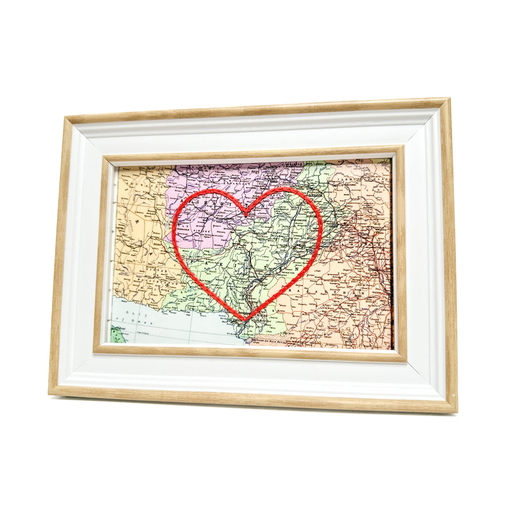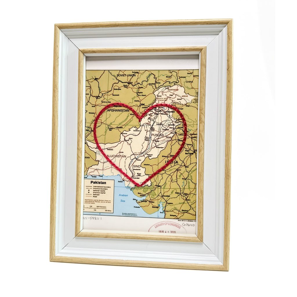 This vintage Pakistan map print has been hand-embroidered with a red heart that symbolizes the places, people, and adventures you hold dear.