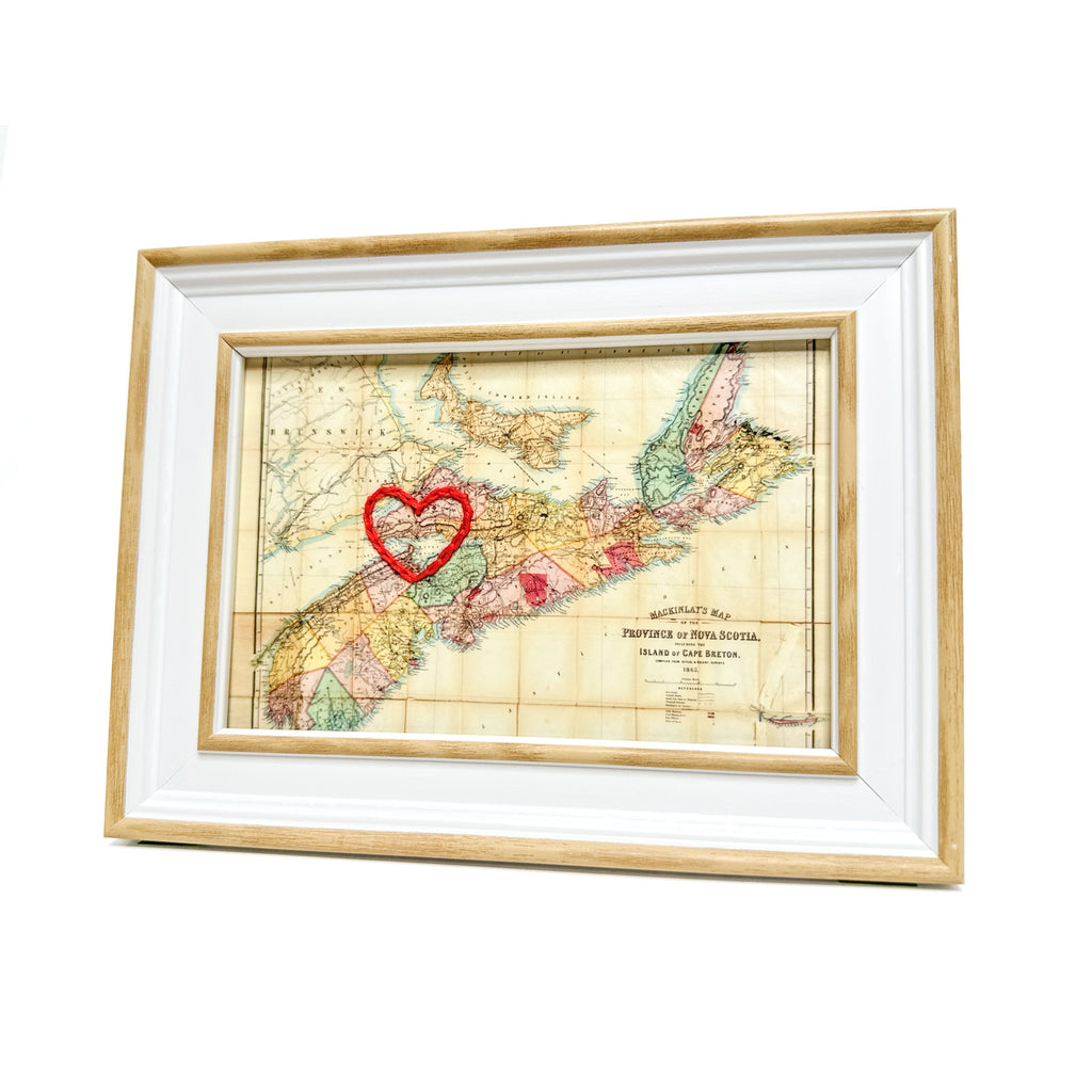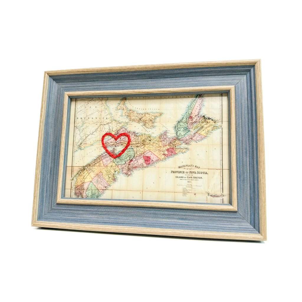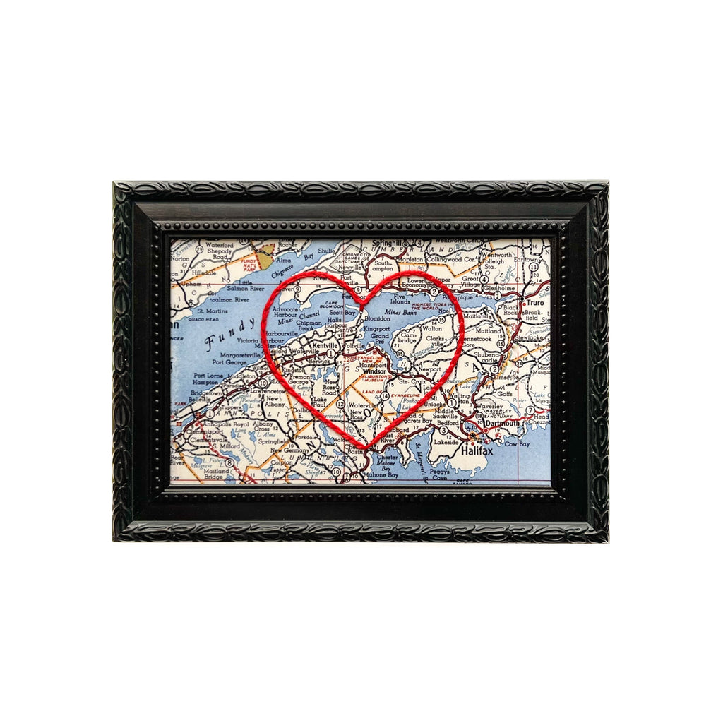This vintage Parrsboro, Nova Scotia map print has been hand-embroidered with a red heart that symbolizes the places, people, and adventures you hold dear.