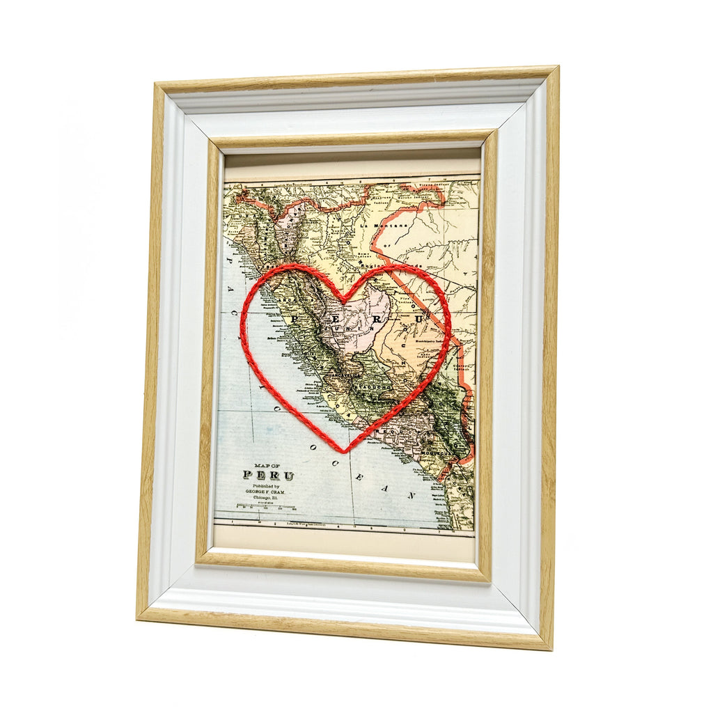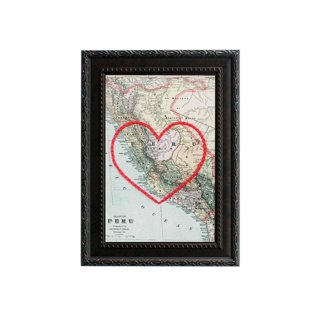 This vintage Peru map print has been hand-embroidered with a red heart that symbolizes the places, people, and adventures you hold dear.