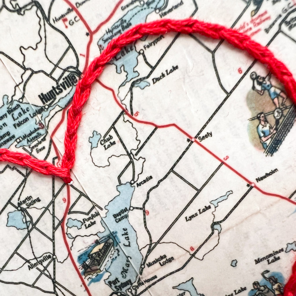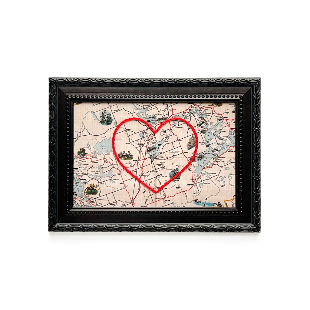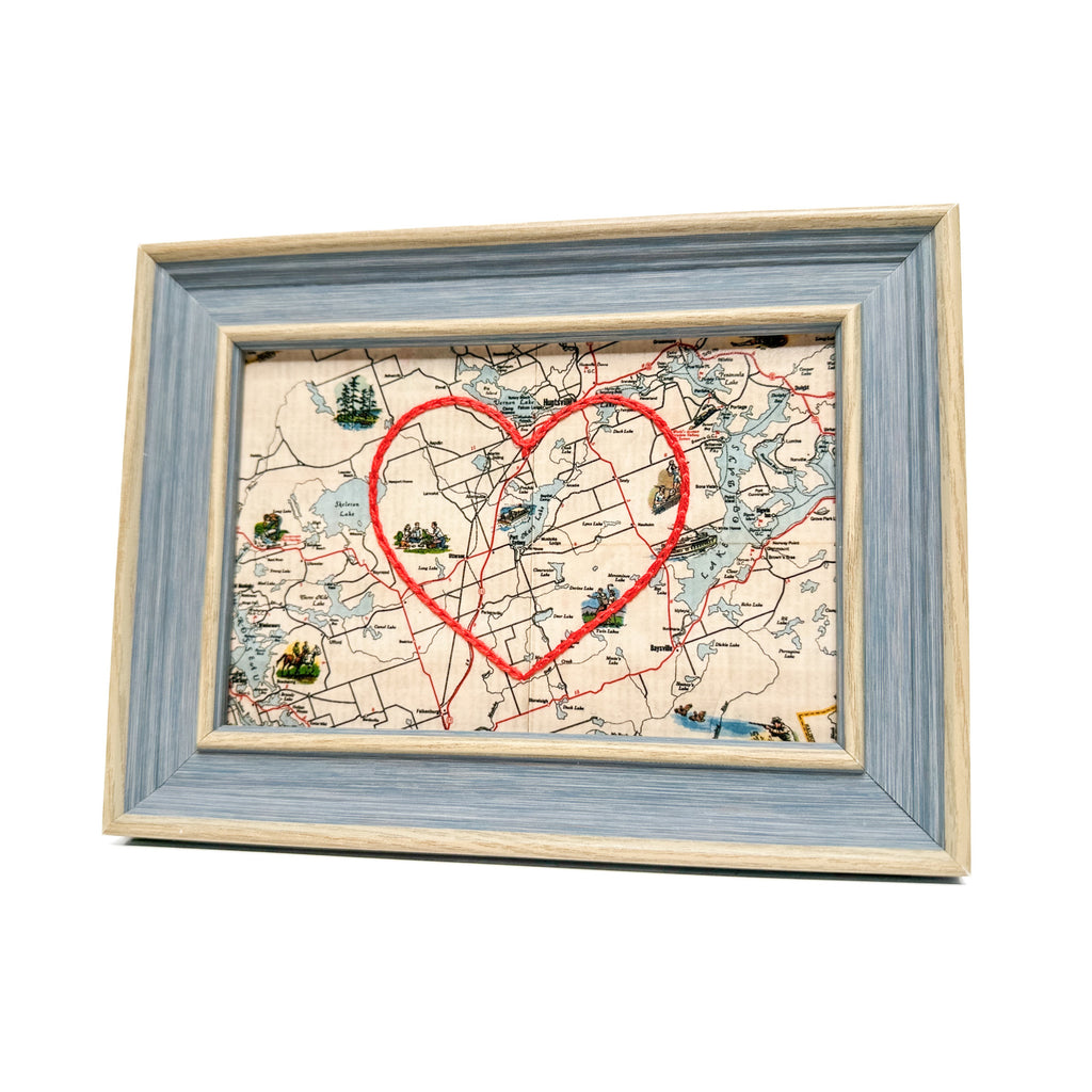 This vintage Port Sydney, Ontario map print has been hand-embroidered with a red heart that symbolizes the places, people, and adventures you hold dear.