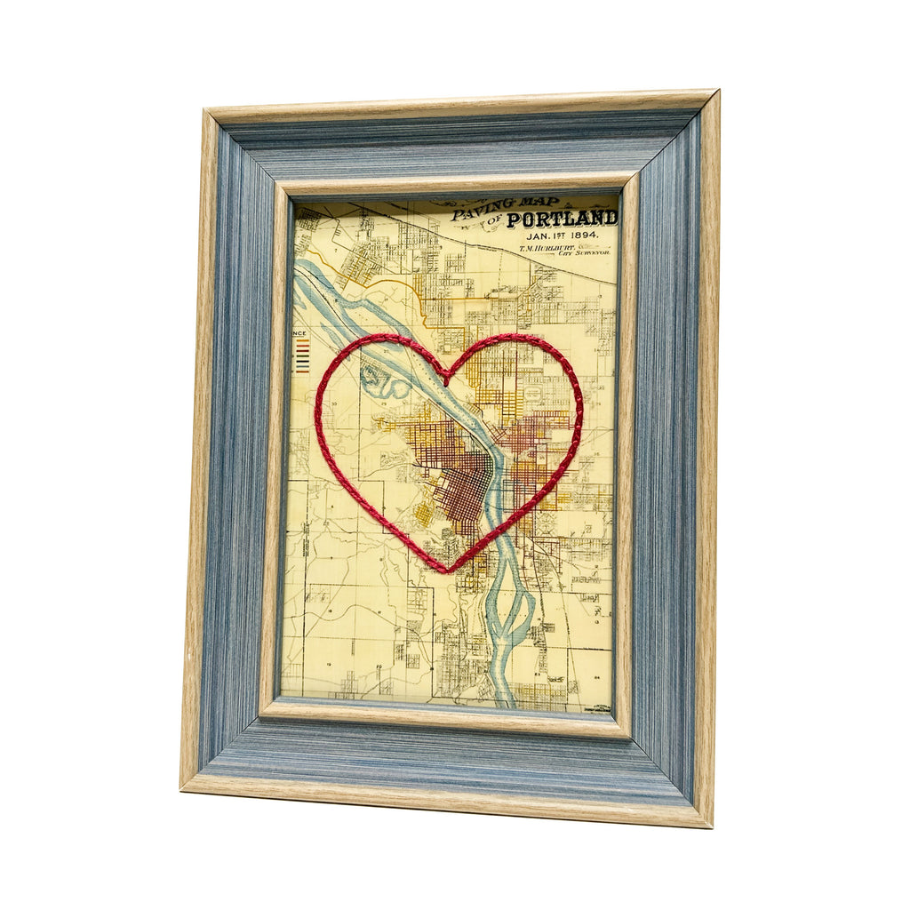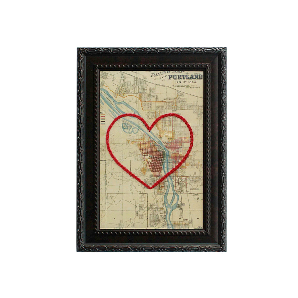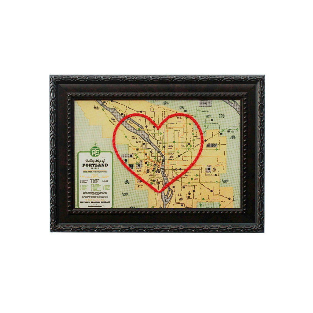 This vintage Portland, Oregon map print has been hand-embroidered with a red heart that symbolizes the places, people, and adventures you hold dear.