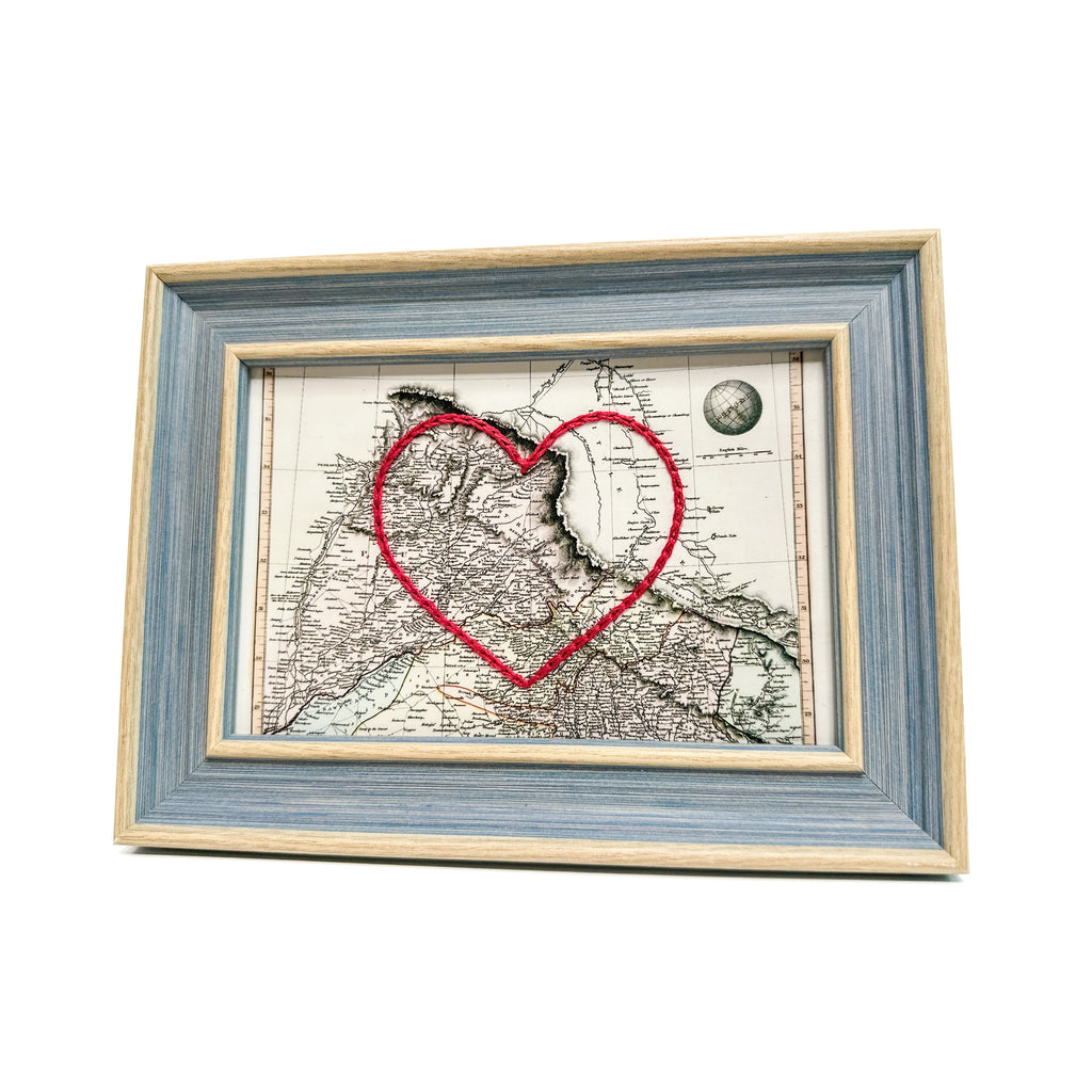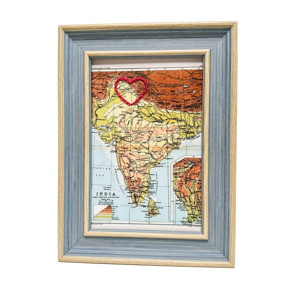 This vintage Punjab, India map print has been hand-embroidered with a red heart - symbolizing the places, people, and adventures you hold dear.