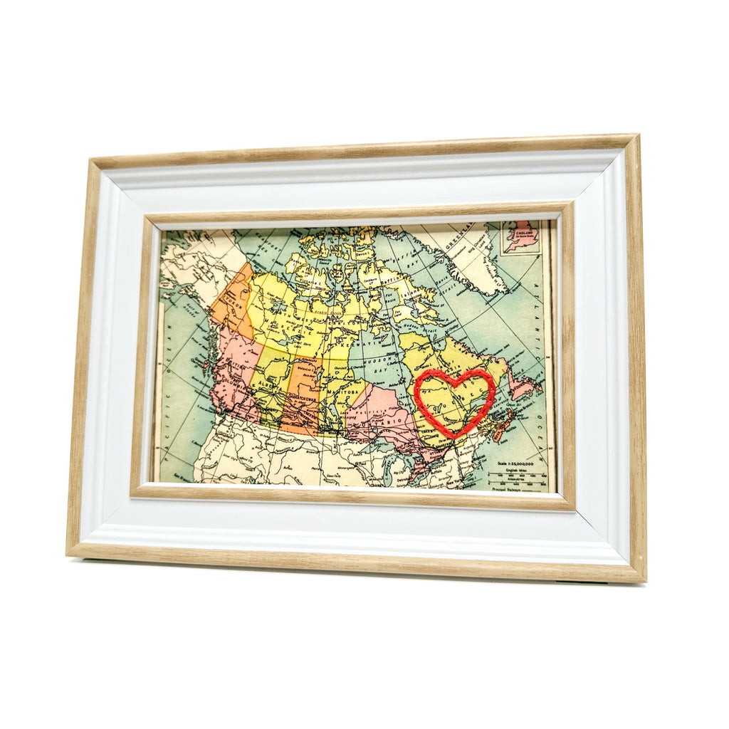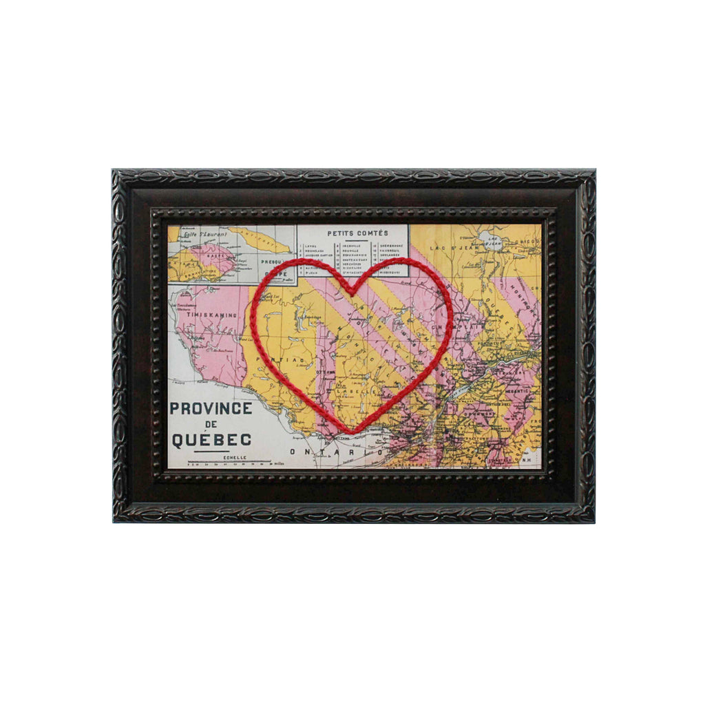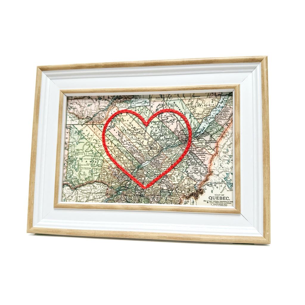 This vintage Quebec map print has been hand-embroidered with a red heart that symbolizes the places, people, and adventures you hold dear.