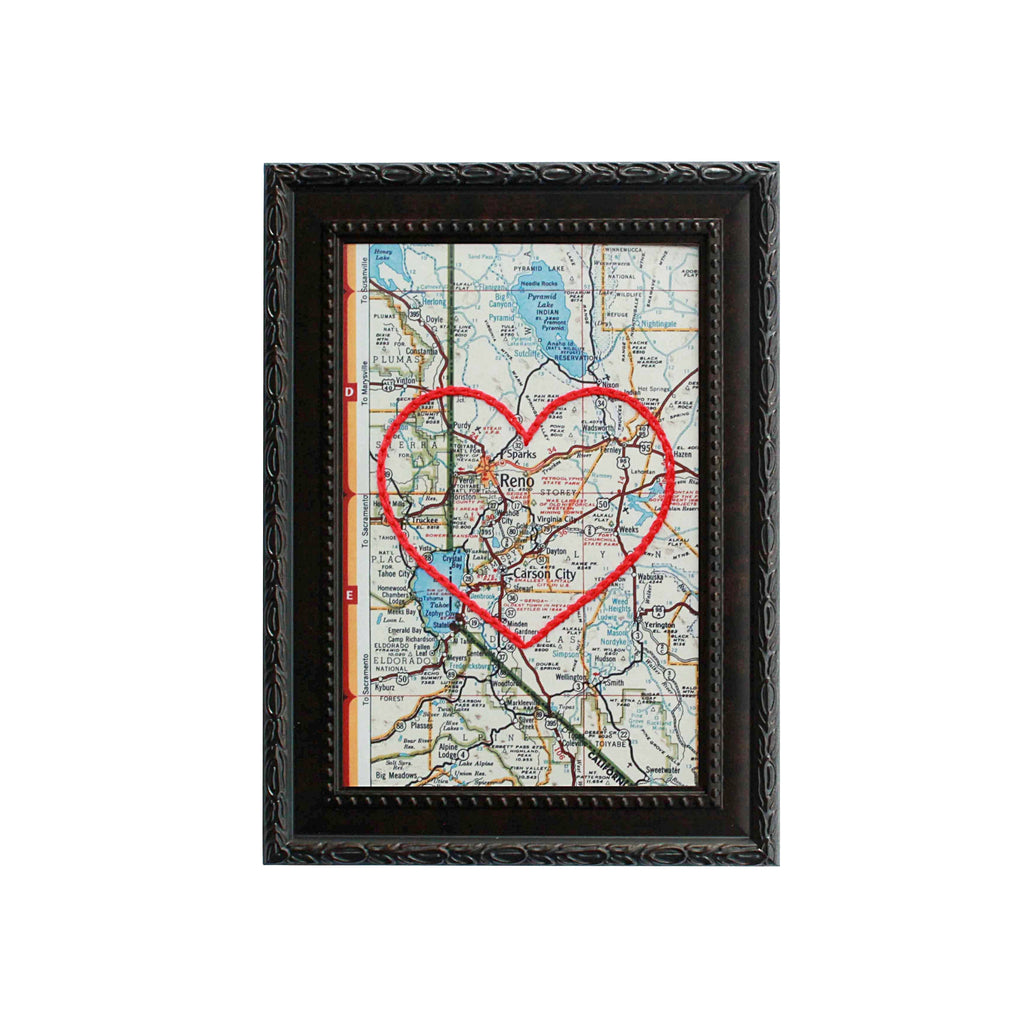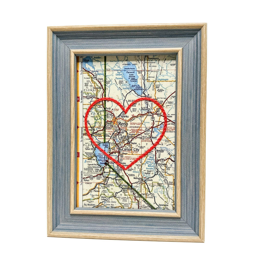 This vintage Reno / Carson City, Nevada map print has been hand-embroidered with a red heart that symbolizes the places, people, and adventures you hold dear.