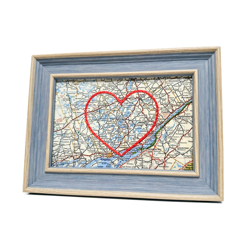 This vintage Rideau Lakes, Ontario map print has been hand-embroidered with a red heart that symbolizes the places, people, and adventures you hold dear.