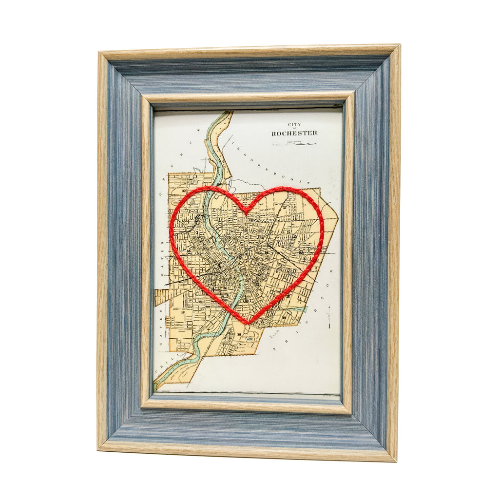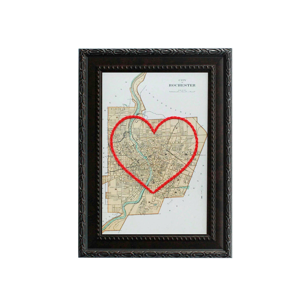 This vintage Rochester, New York map print has been hand-embroidered with a red heart that symbolizes the places, people, and adventures you hold dear.