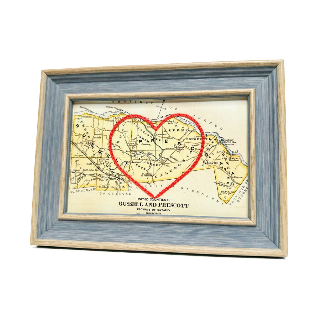 This vintage Russell & Prescott County, Ontario map print has been hand-embroidered with a red heart that symbolizes the places, people, and adventures you hold dear.
