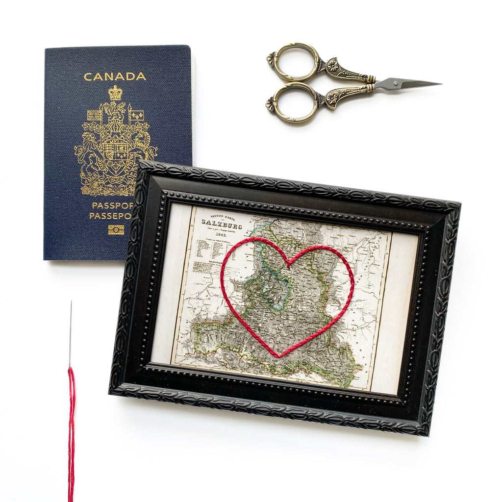 This vintage Salzburg, Austria map print has been hand-embroidered with a red heart that symbolizes the places, people, and adventures you hold dear.