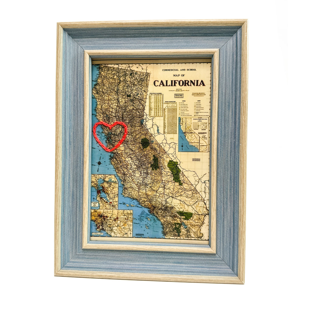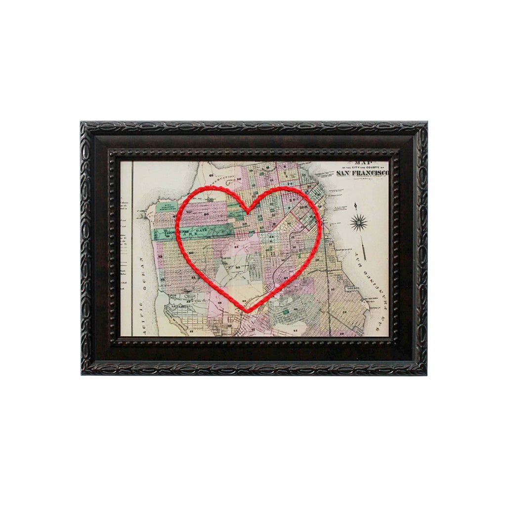 This vintage San Francisco, California map print has been hand-embroidered with a red heart that symbolizes the places, people, and adventures you hold dear.