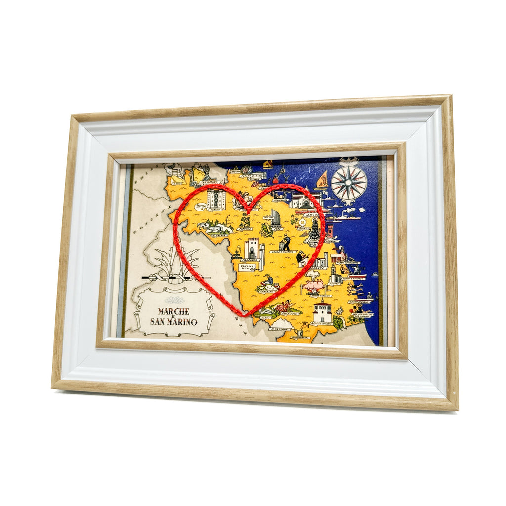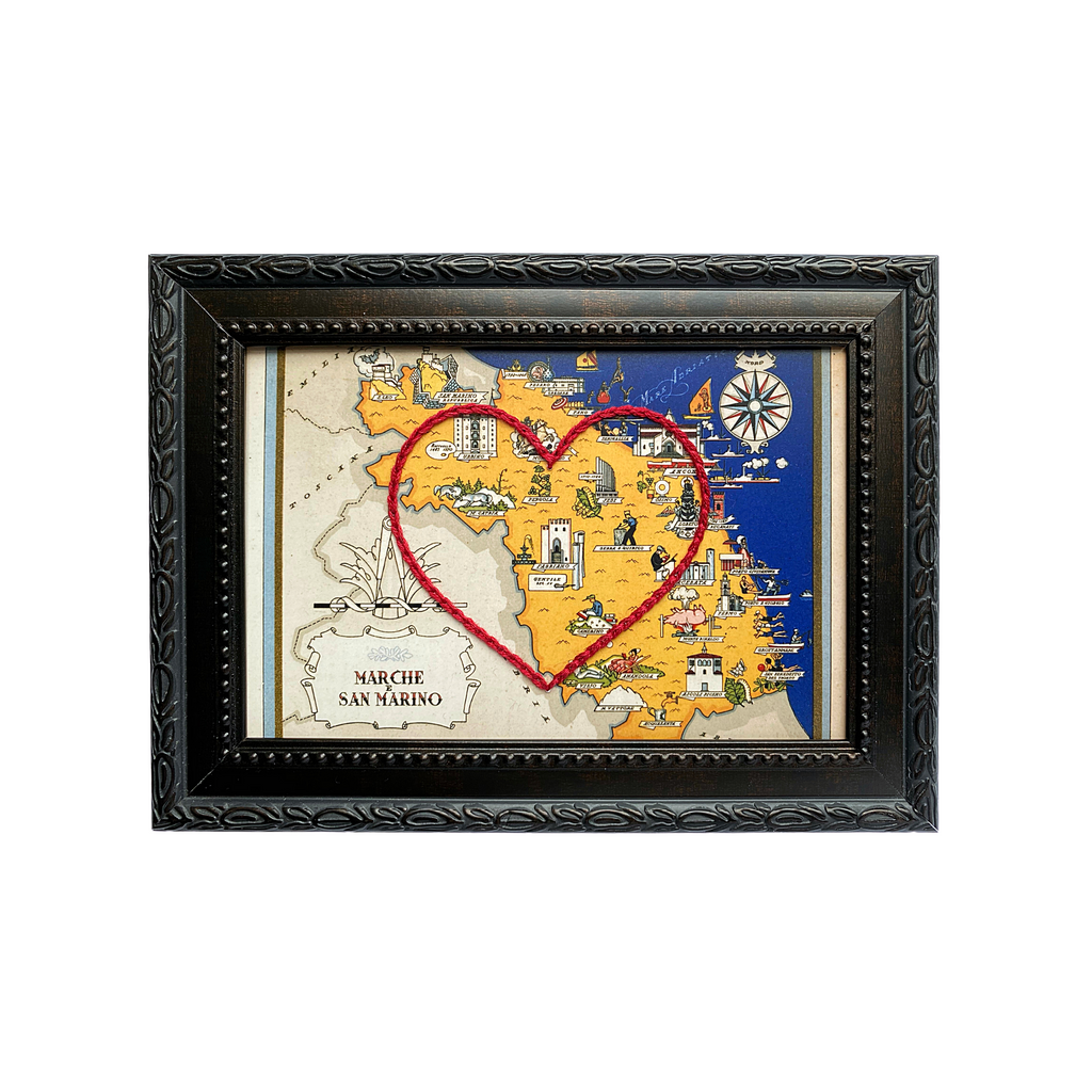 This vintage San Marino map print has been hand-embroidered with a red heart that symbolizes the places, people, and adventures you hold dear.
