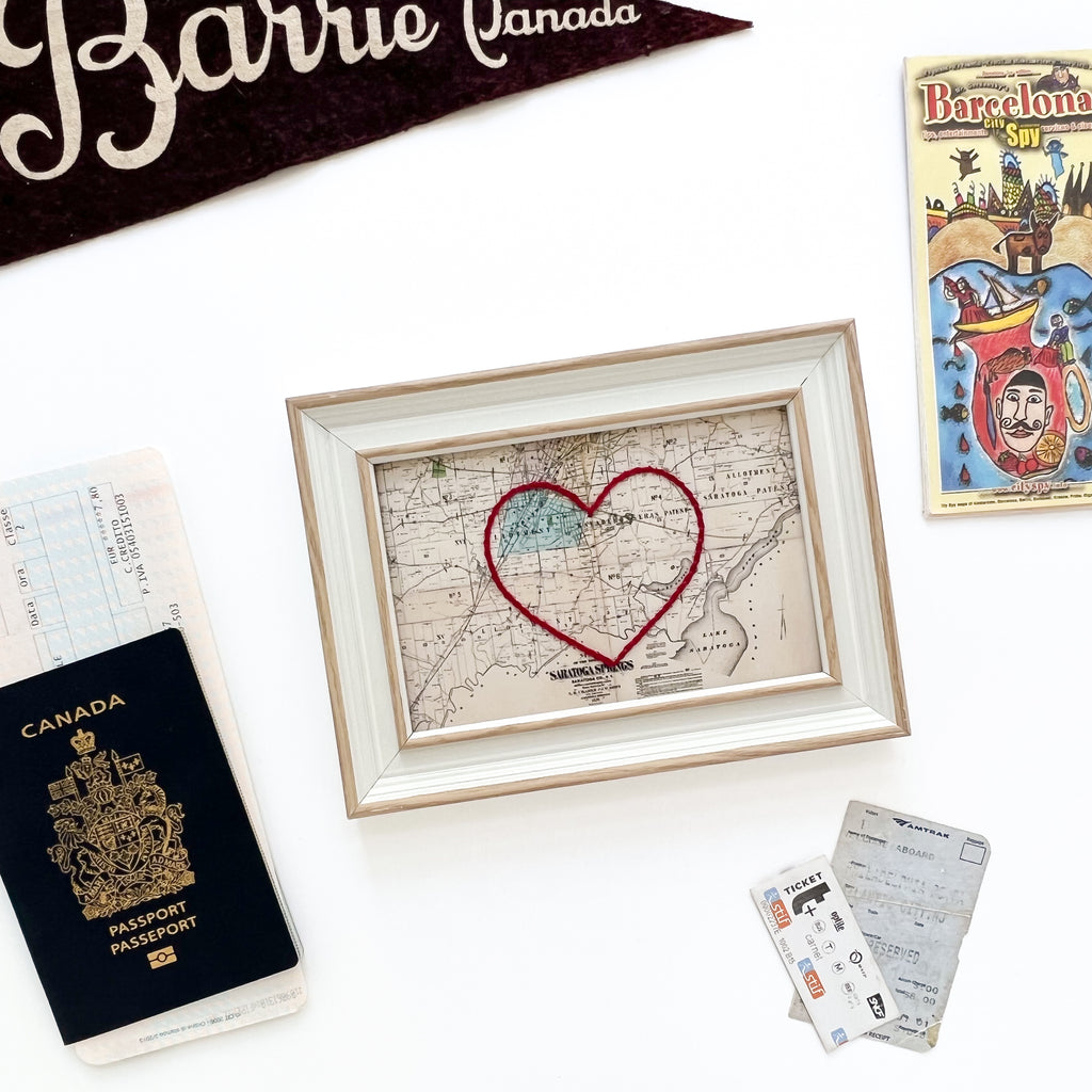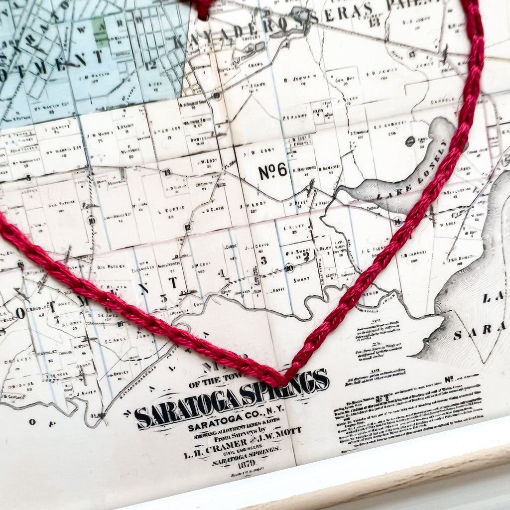 This vintage Saratoga Springs, New York map print has been hand-embroidered with a red heart that symbolizes the places, people, and adventures you hold dear.