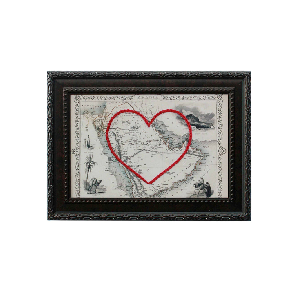 This vintage Saudi Arabia map print has been hand-embroidered with a red heart that symbolizes the places, people, and adventures you hold dear.