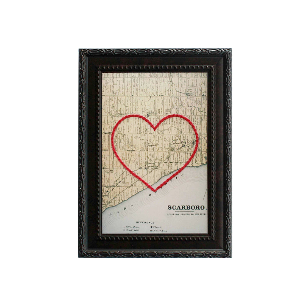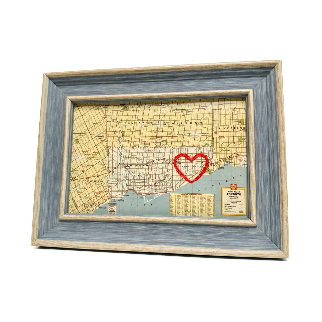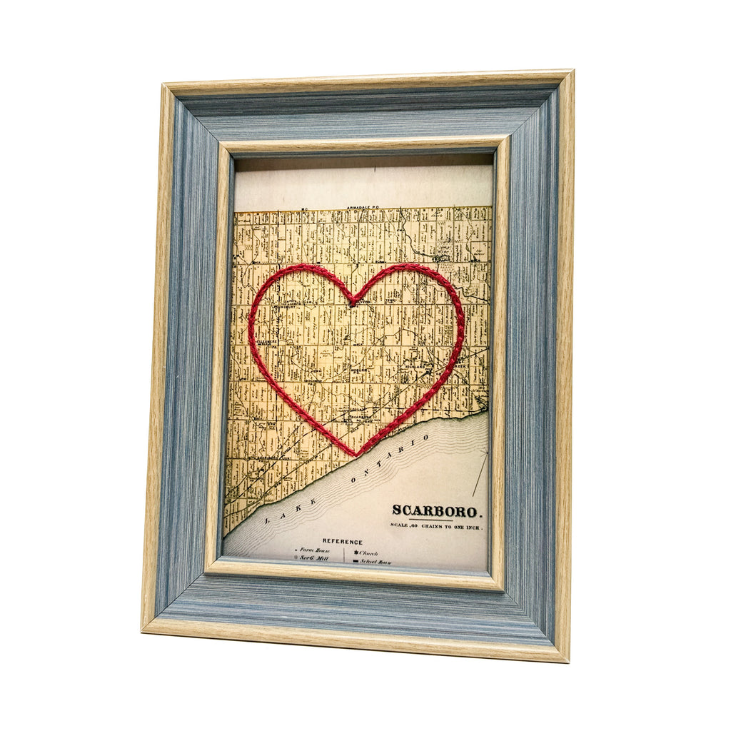 This vintage Scarborough, Toronto map print has been hand-embroidered with a red heart that symbolizes the places, people, and adventures you hold dear.