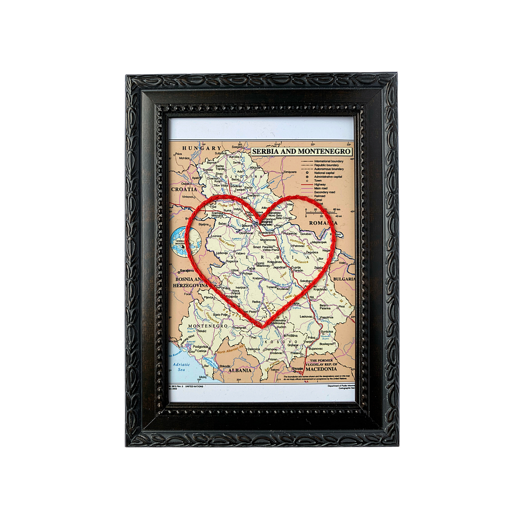 This vintage Serbia and Montenegro map print has been hand-embroidered with a red heart that symbolizes the places, people, and adventures you hold dear.