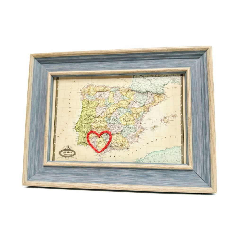 This vintage Spain map print has been hand-embroidered with a red heart around Seville symbolizing the places, people, and adventures you hold dear.