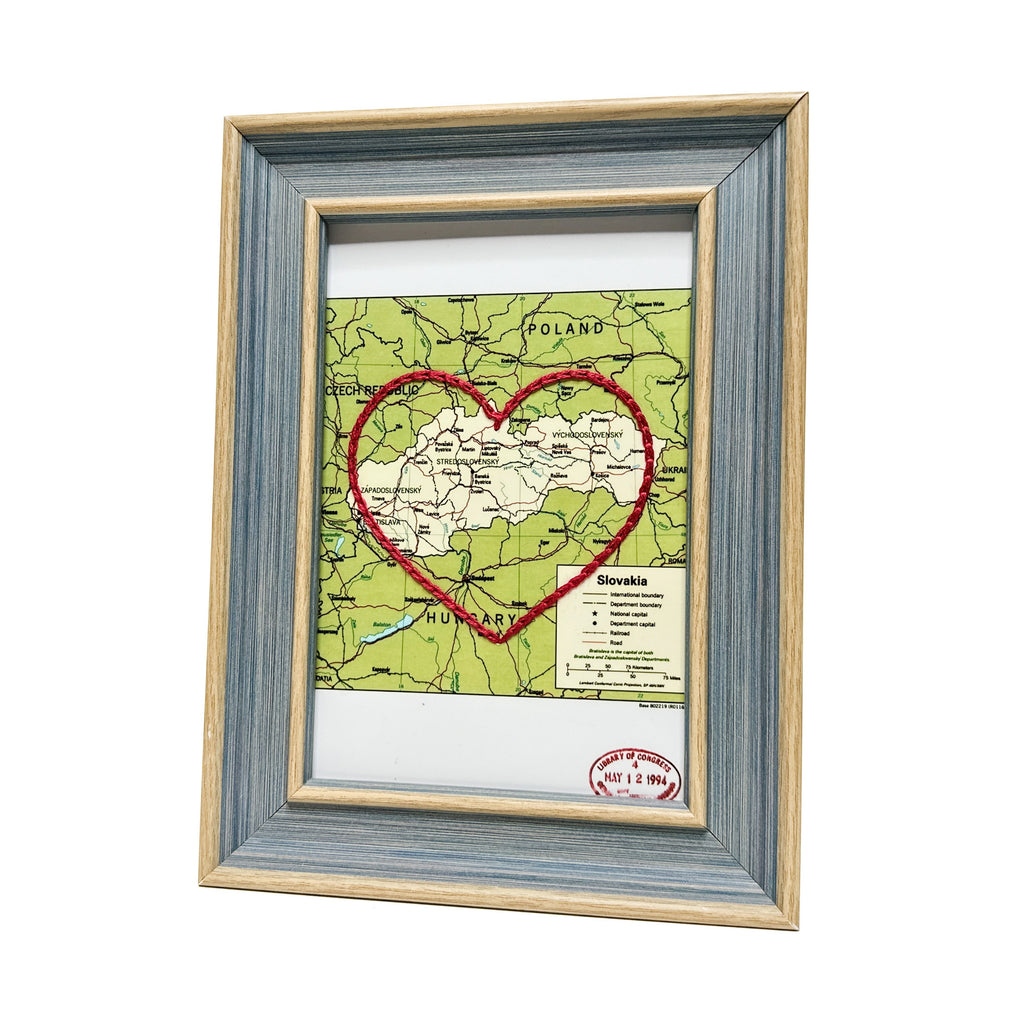 This vintage Slovakia map print has been hand-embroidered with a red heart - symbolizing the places, people, and adventures you hold dear.