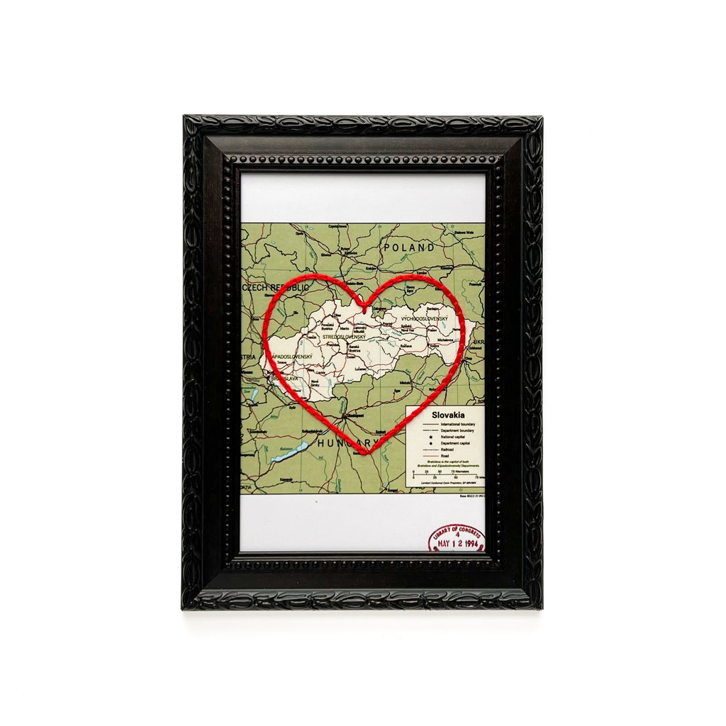 Framed and Ready to Gift: Our Slovakia Heart Map is framed for your convenience in a complimentary vintage-inspired frame! See product photos for options. All frames can be hung or displayed on a wall or shelf - whichever suits the owner best (except 11x14 frames - which can only be hung).