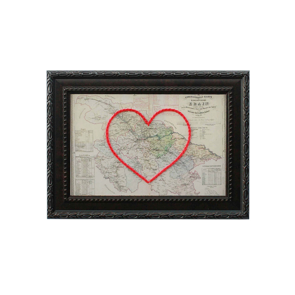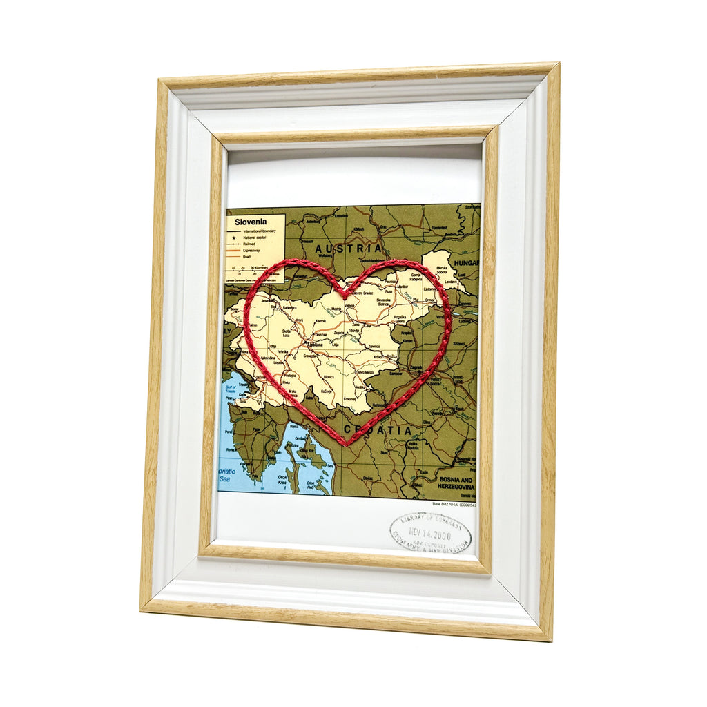 This vintage Slovenia map print has been hand-embroidered with a red heart - symbolizing the places, people, and adventures you hold dear.