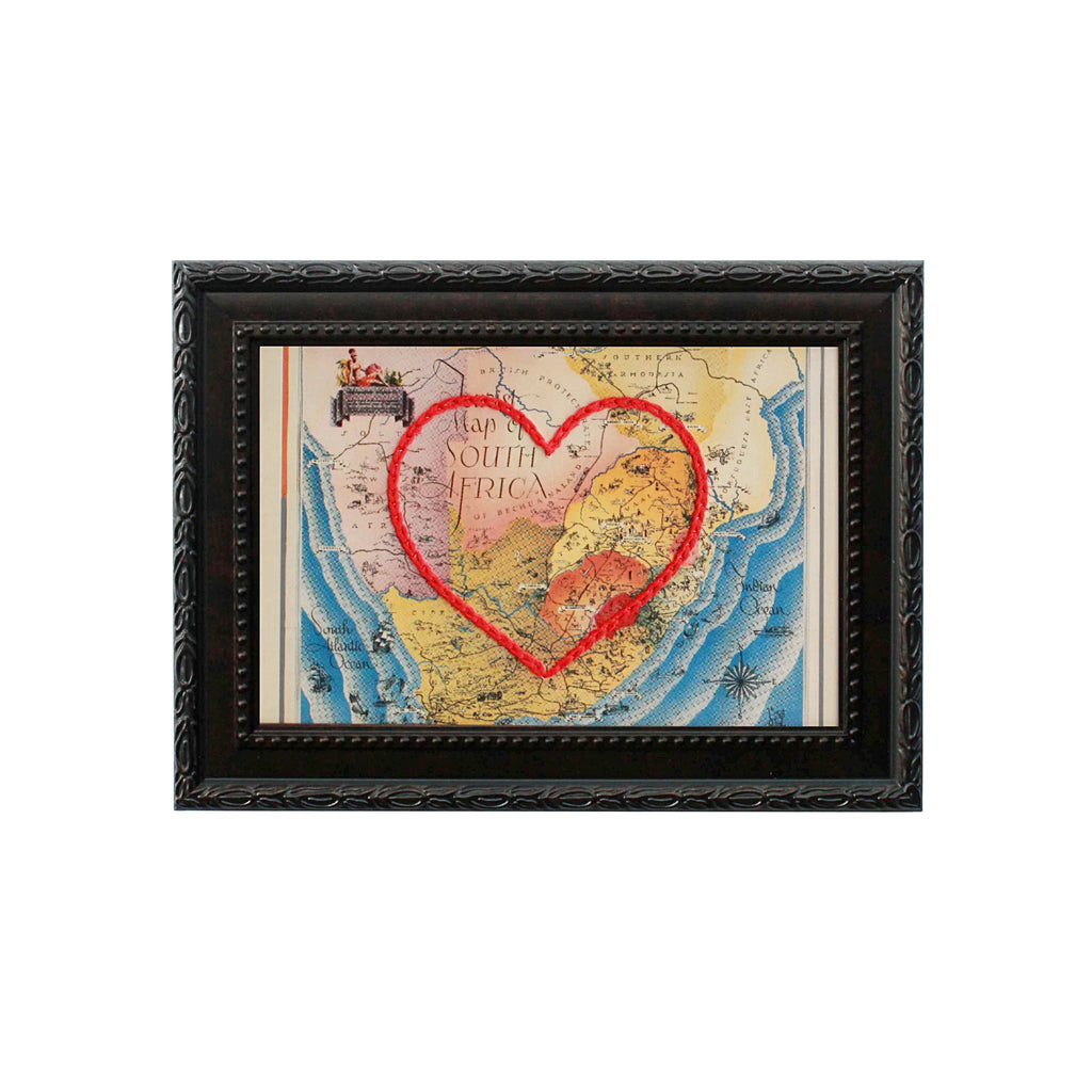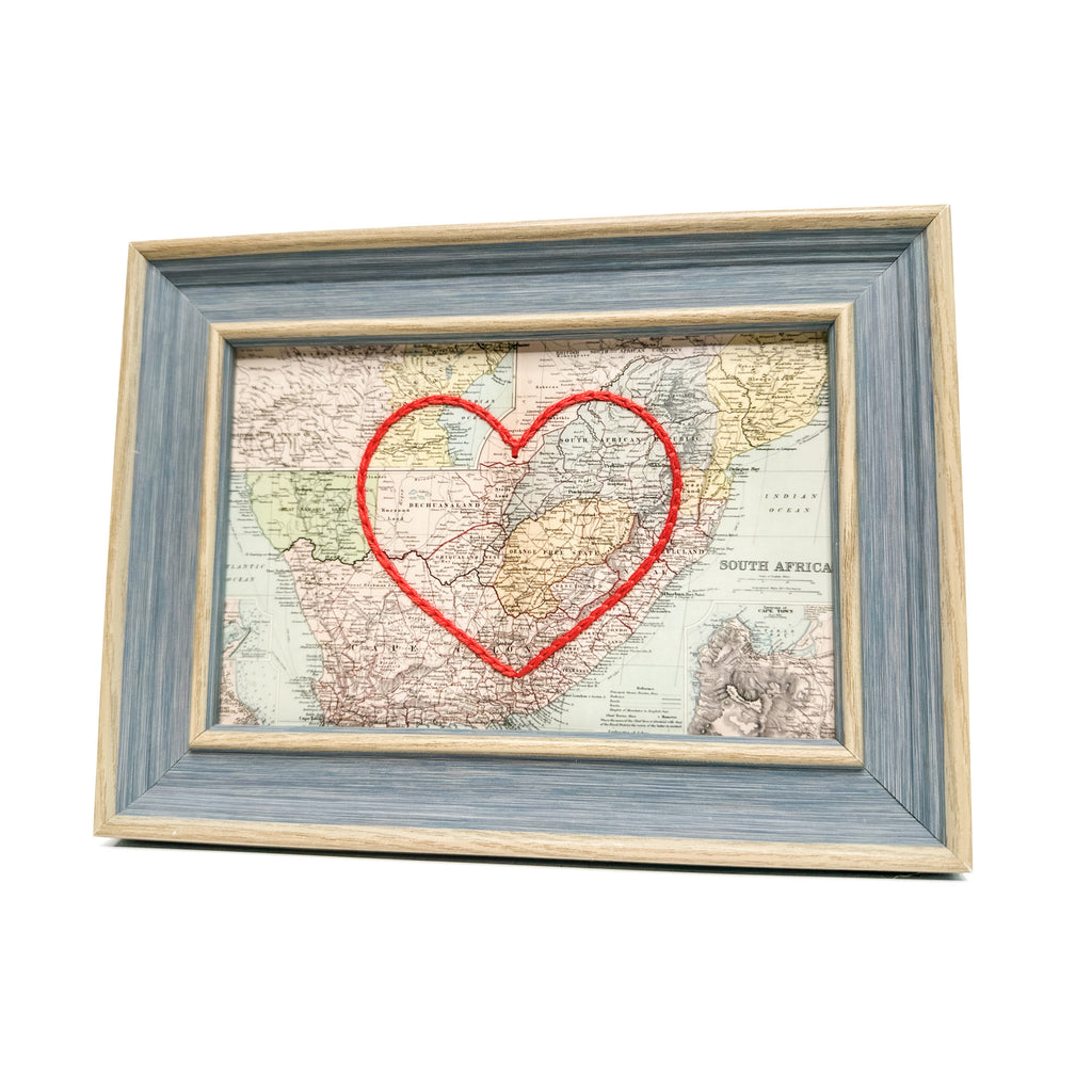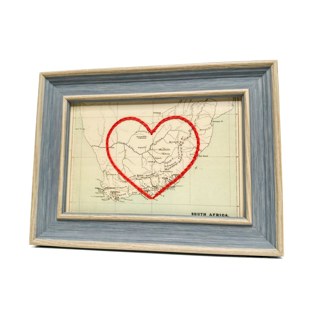 This vintage South Africa map print has been hand-embroidered with a red heart - symbolizing the places, people, and adventures you hold dear.