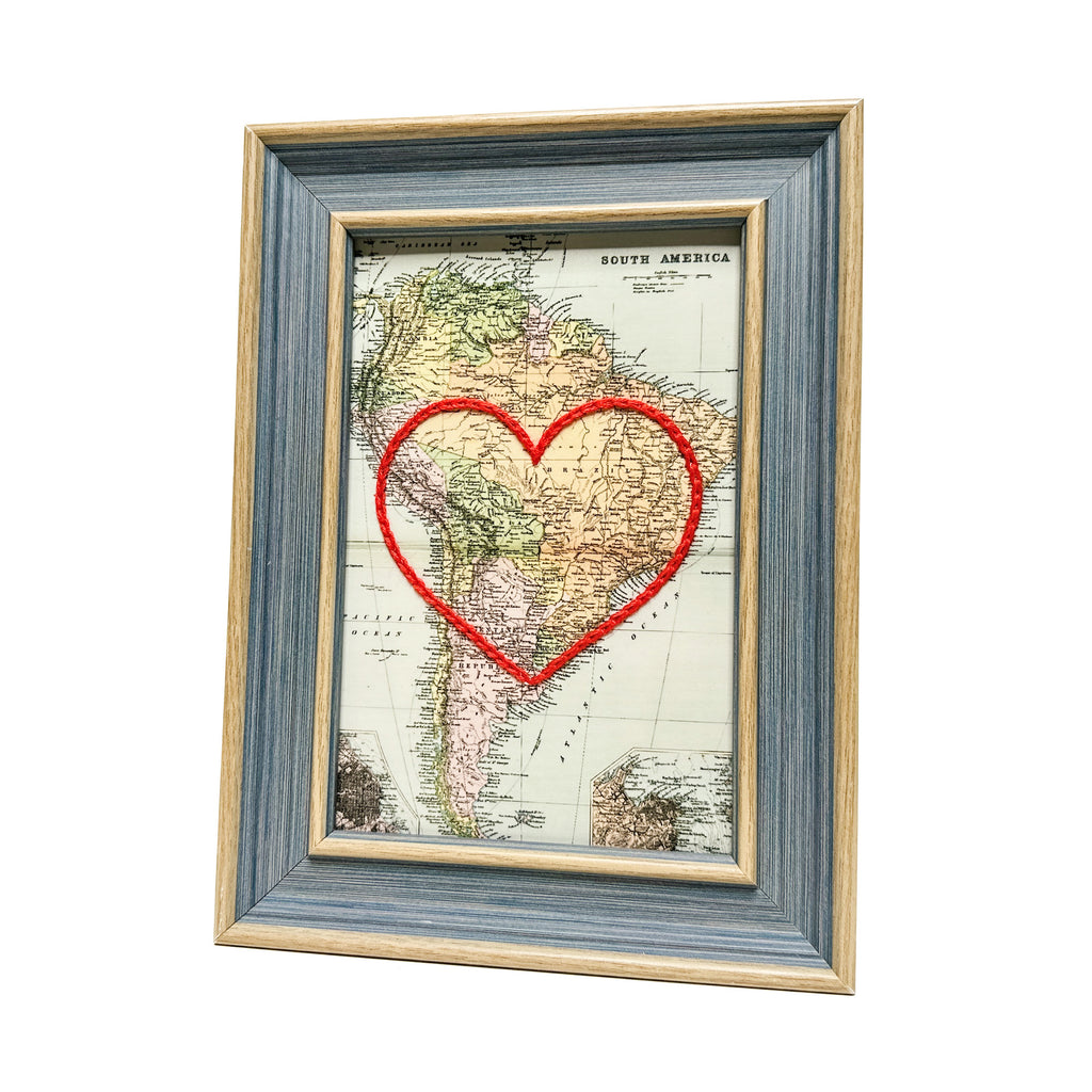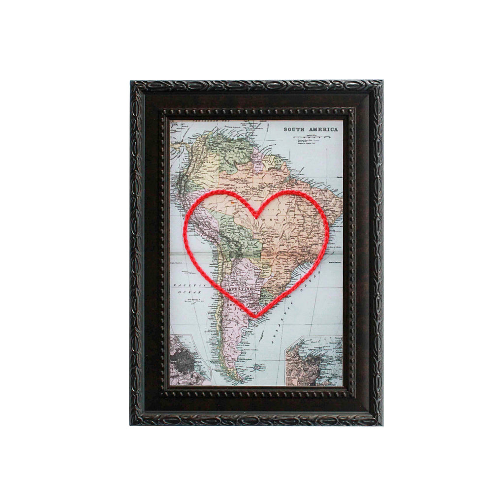 This vintage South America map print has been hand-embroidered with a red heart - symbolizing the places, people, and adventures you hold dear.