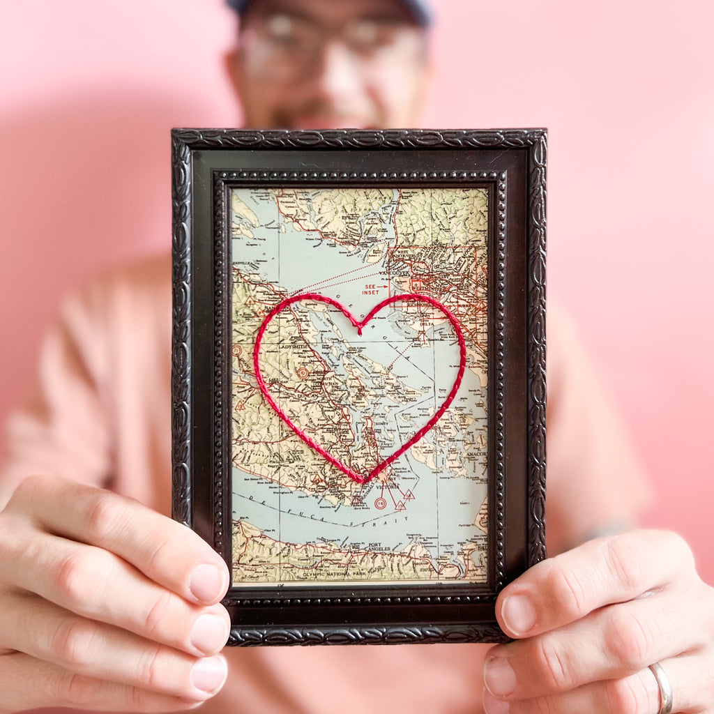 This vintage Southern Gulf Islands, British Columbia map print has been hand-embroidered with a red heart - symbolizing the places, people, and adventures you hold dear.