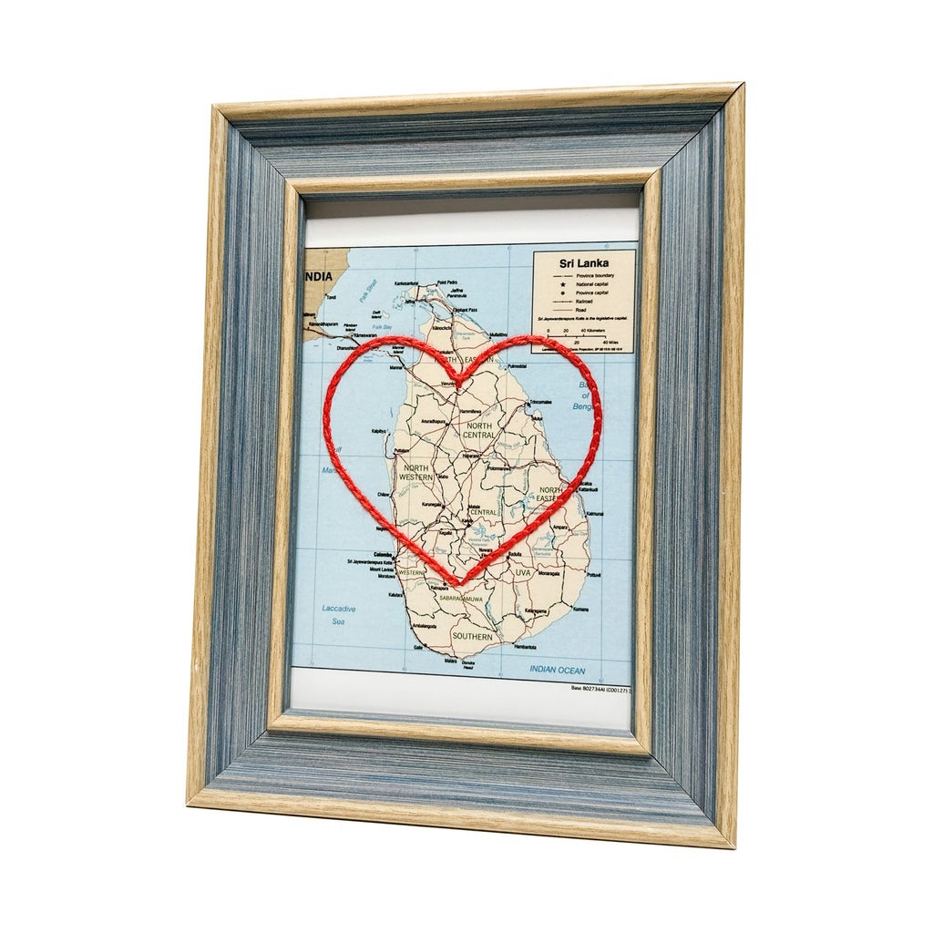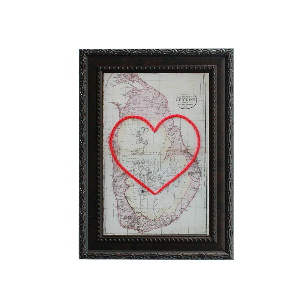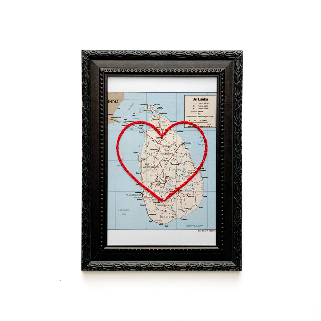 This vintage Sri Lanka map print has been hand-embroidered with a red heart - symbolizing the places, people, and adventures you hold dear.