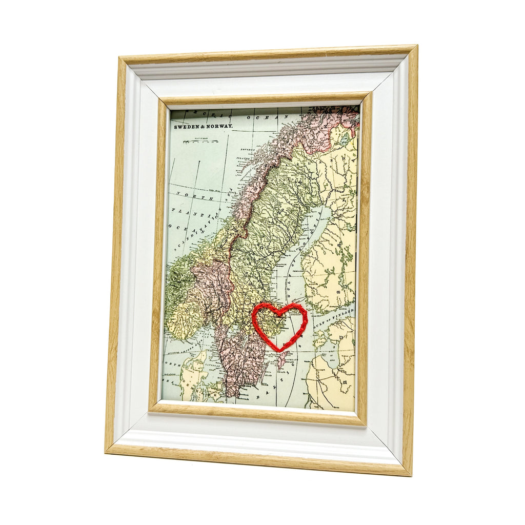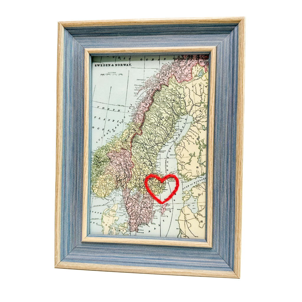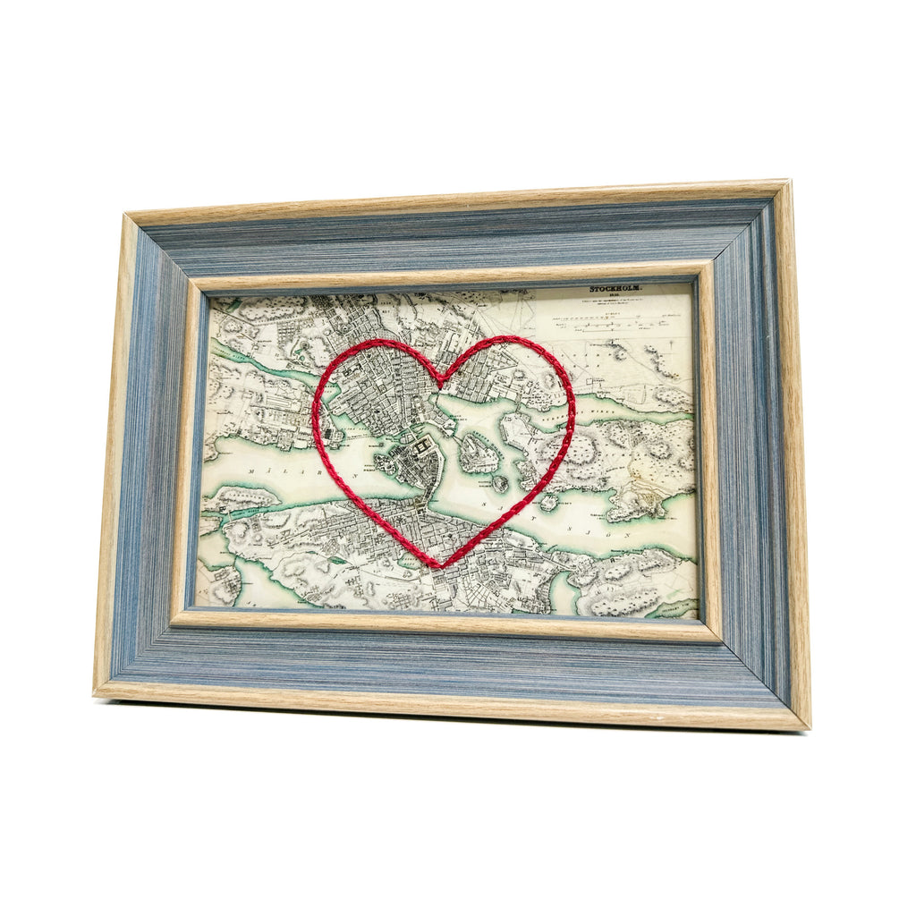 This vintage Stockholm, Sweden map print has been hand-embroidered with a red heart - symbolizing the places, people, and adventures you hold dear.