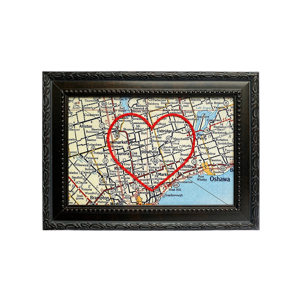Framed and Ready to Gift: Our Stouffville Heart Map is framed for your convenience in a complimentary vintage-inspired frame! See product photos for options. All frames can be hung or displayed on a wall or shelf - whichever suits the owner best (except 11x14 frames - which can only be hung).