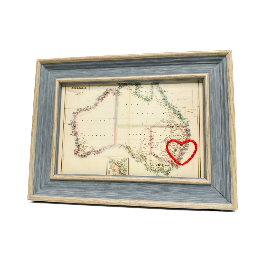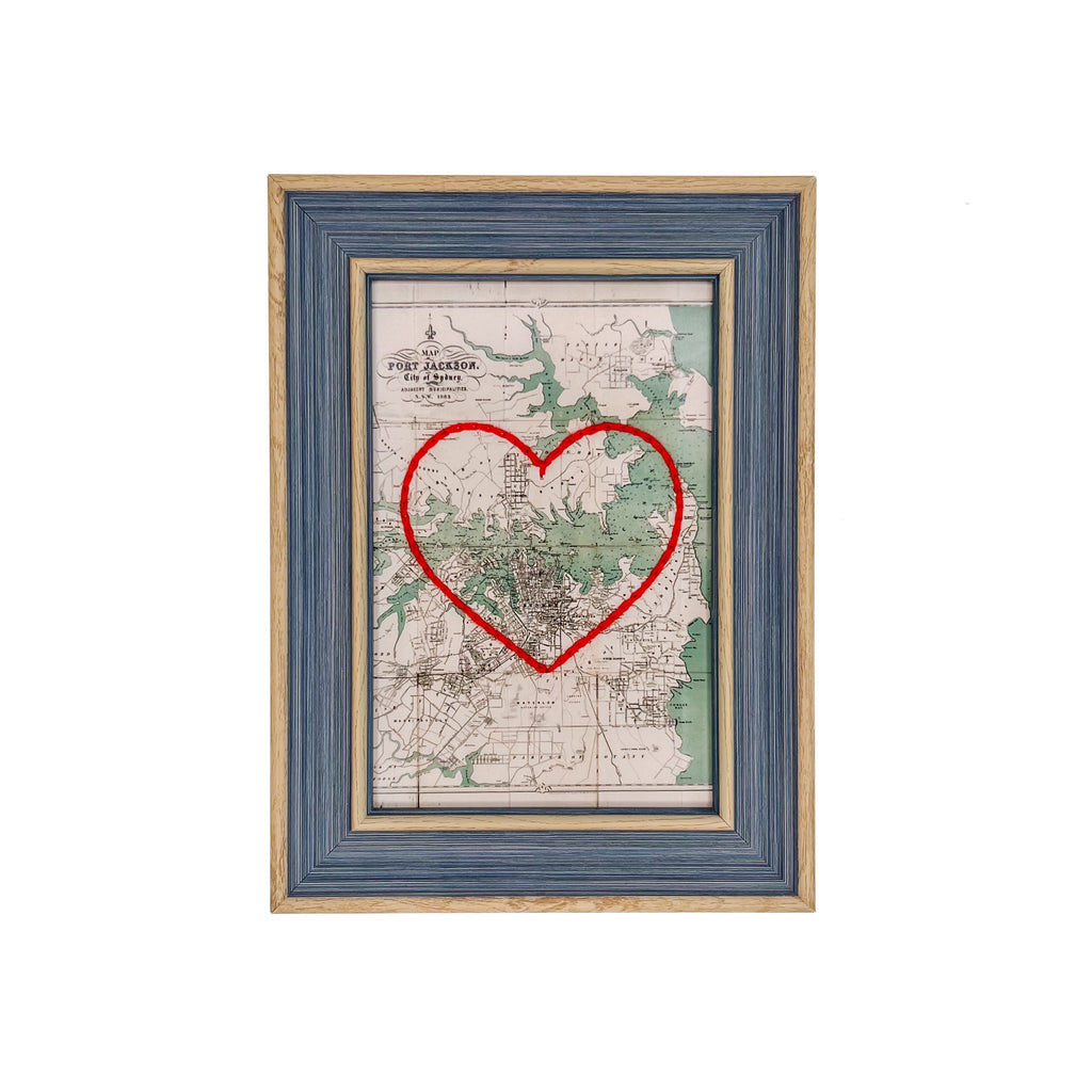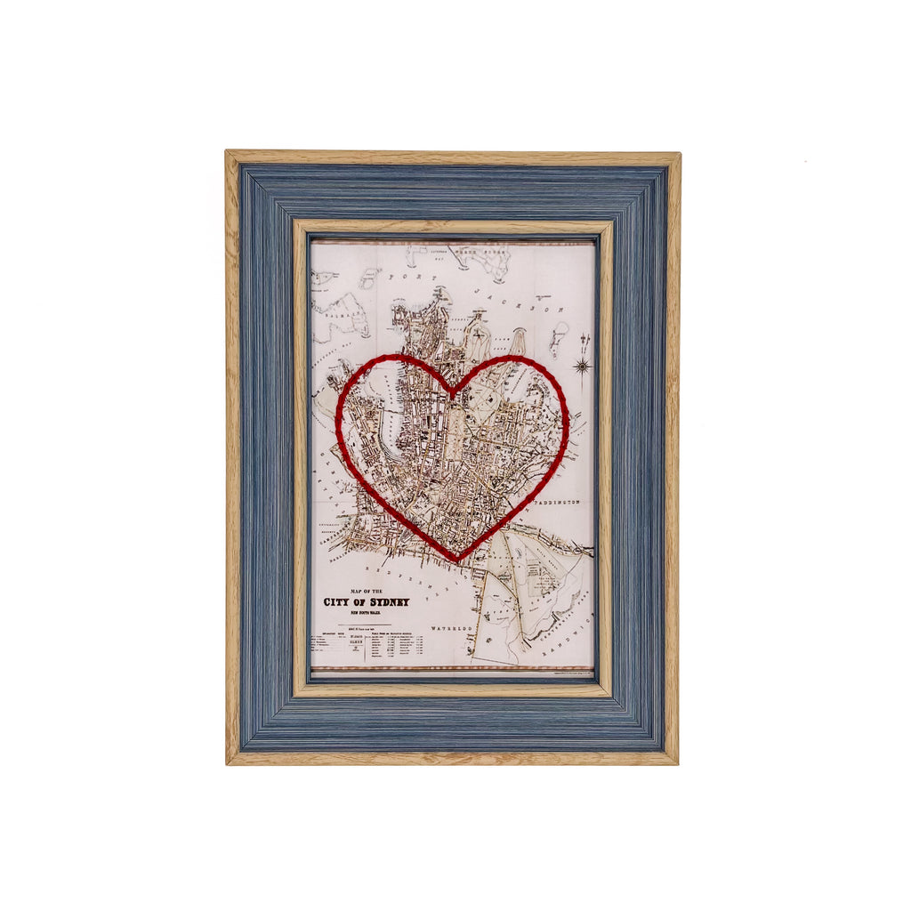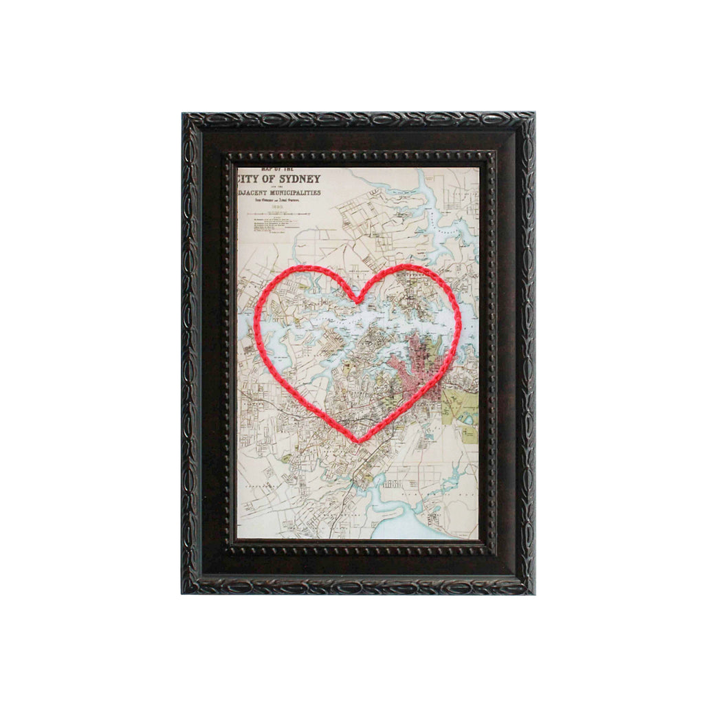 This vintage Sydney, Australia map print has been hand-embroidered with a red heart - symbolizing the places, people, and adventures you hold dear.