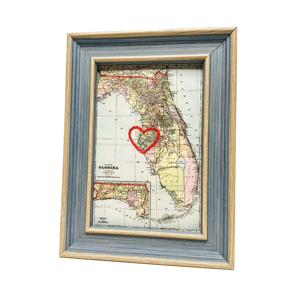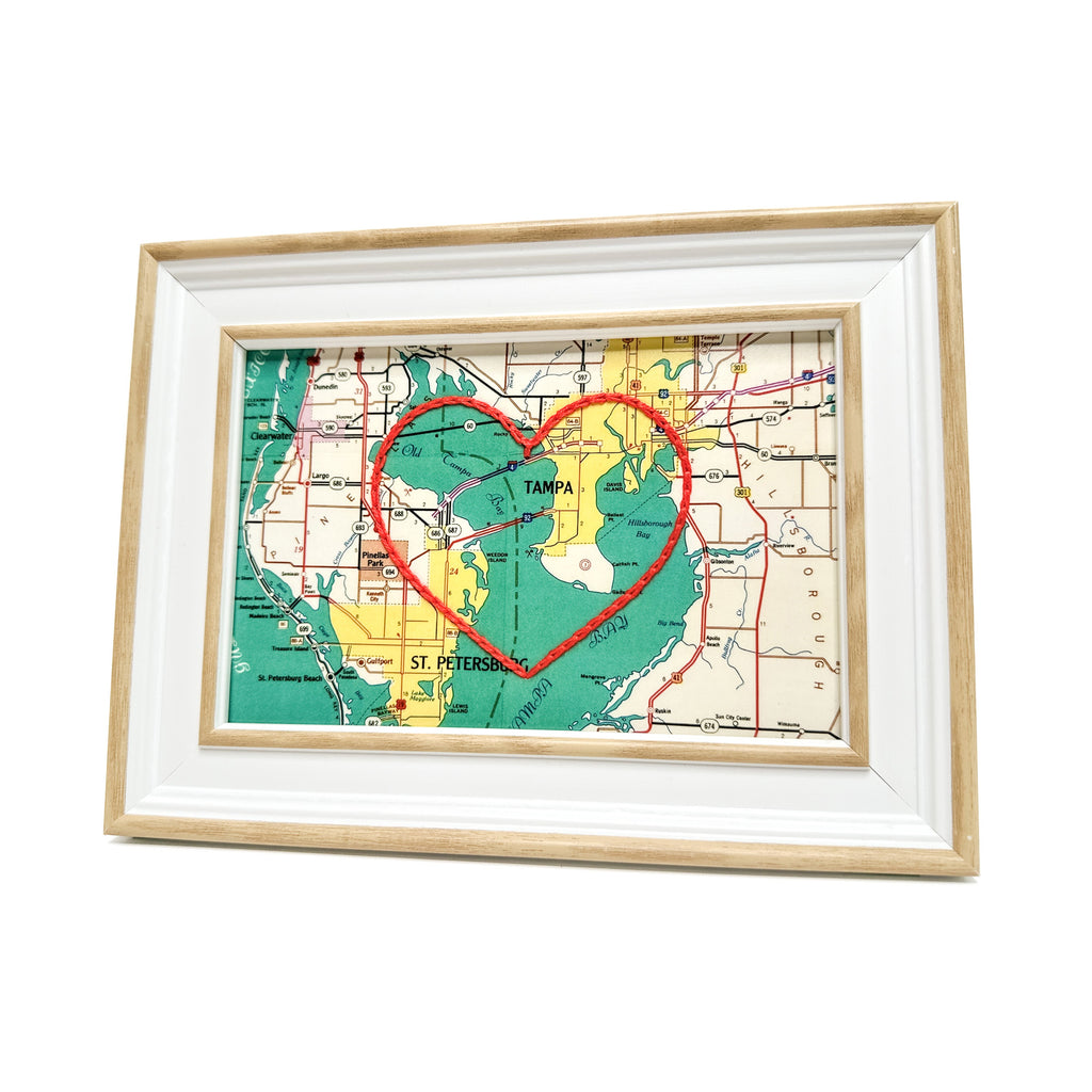 This vintage Tampa Bay, Florida map print has been hand-embroidered with a red heart - symbolizing the places, people, and adventures you hold dear.