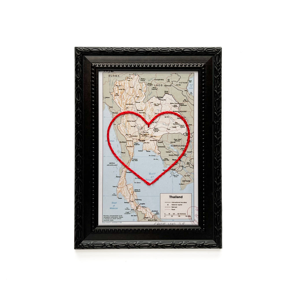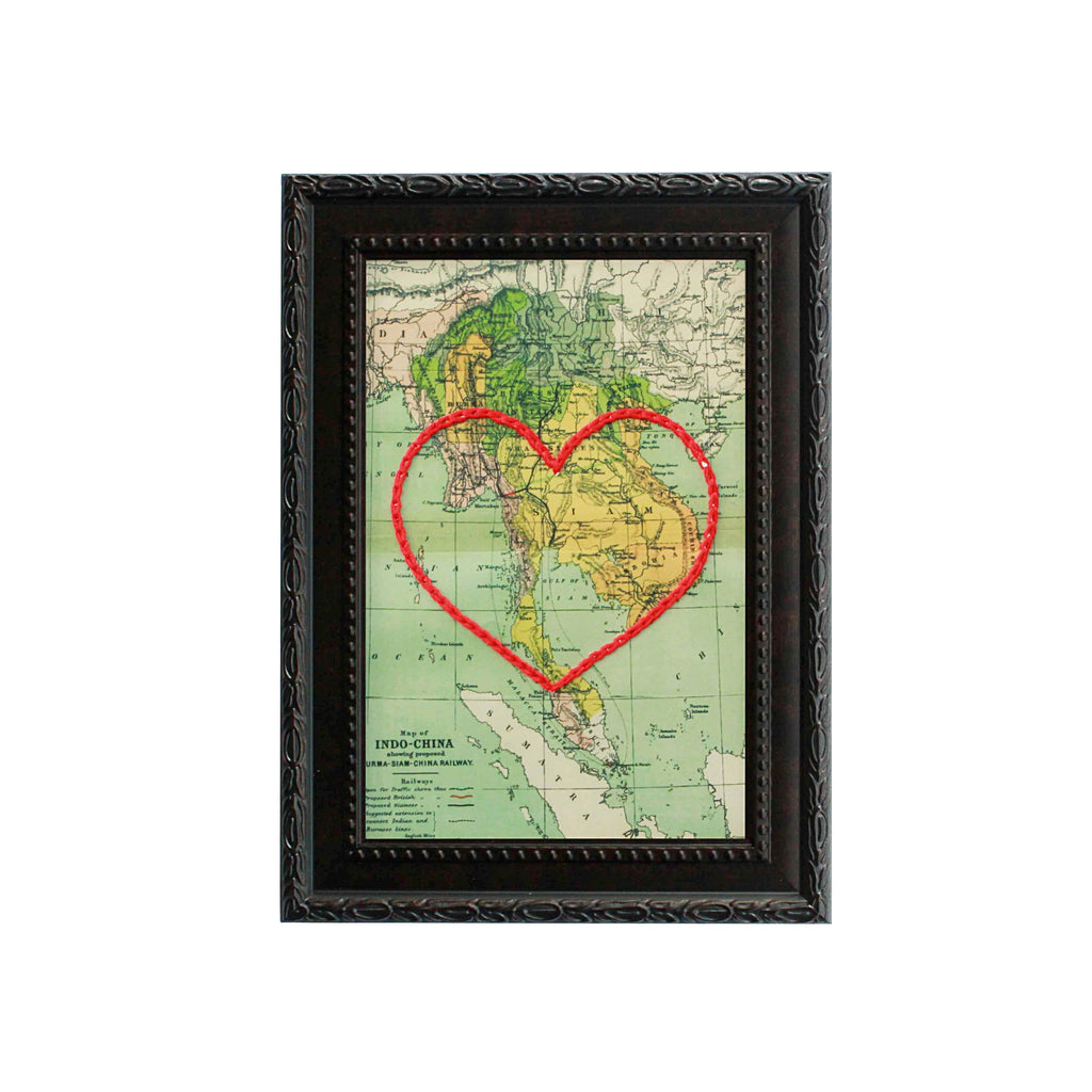 This vintage Thailand map print has been hand-embroidered with a red heart - symbolizing the places, people, and adventures you hold dear.