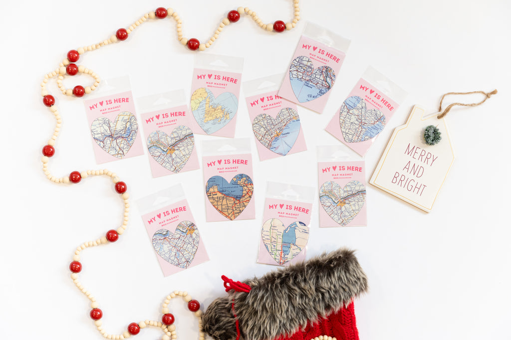 This heart-shaped magnet features a map of Timmins, Ontario, and the surrounding towns, and a card backing that says "My Heart is Here."