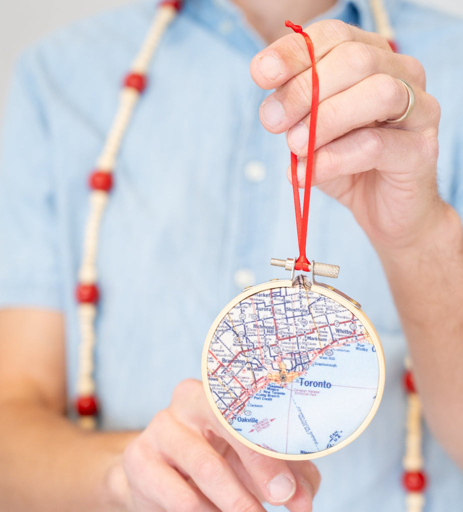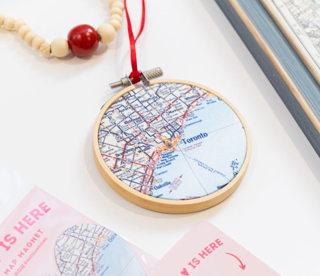 This 3" embroidery hoop features a fabric-printed map of Toronto hung with a satin ribbon.