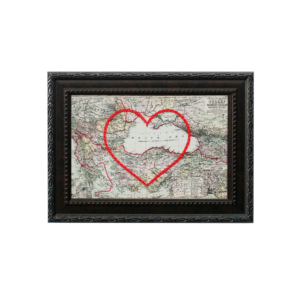 This vintage Turkey and Black Sea map print has been hand-embroidered with a red heart - symbolizing the places, people, and adventures you hold dear.