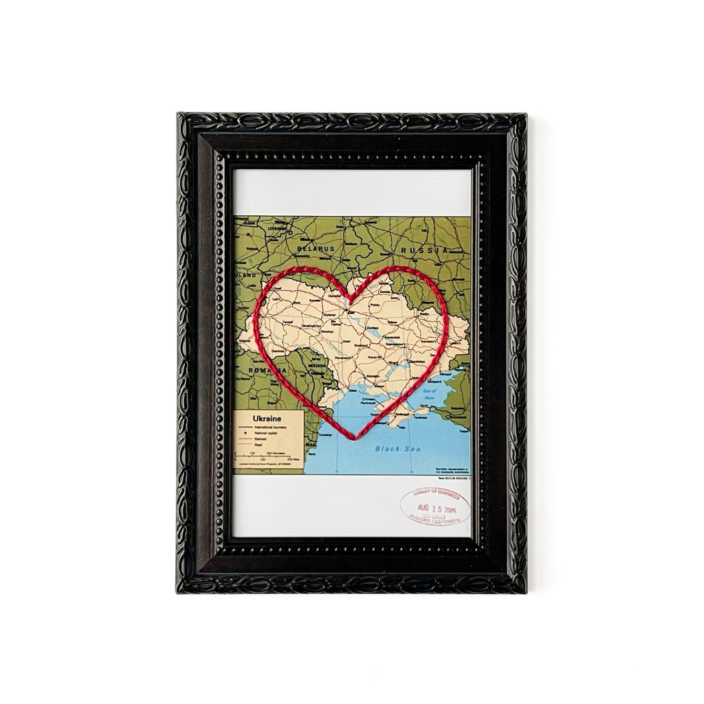 This vintage Ukraine map print has been hand-embroidered with a red heart - symbolizing the places, people, and adventures you hold dear.