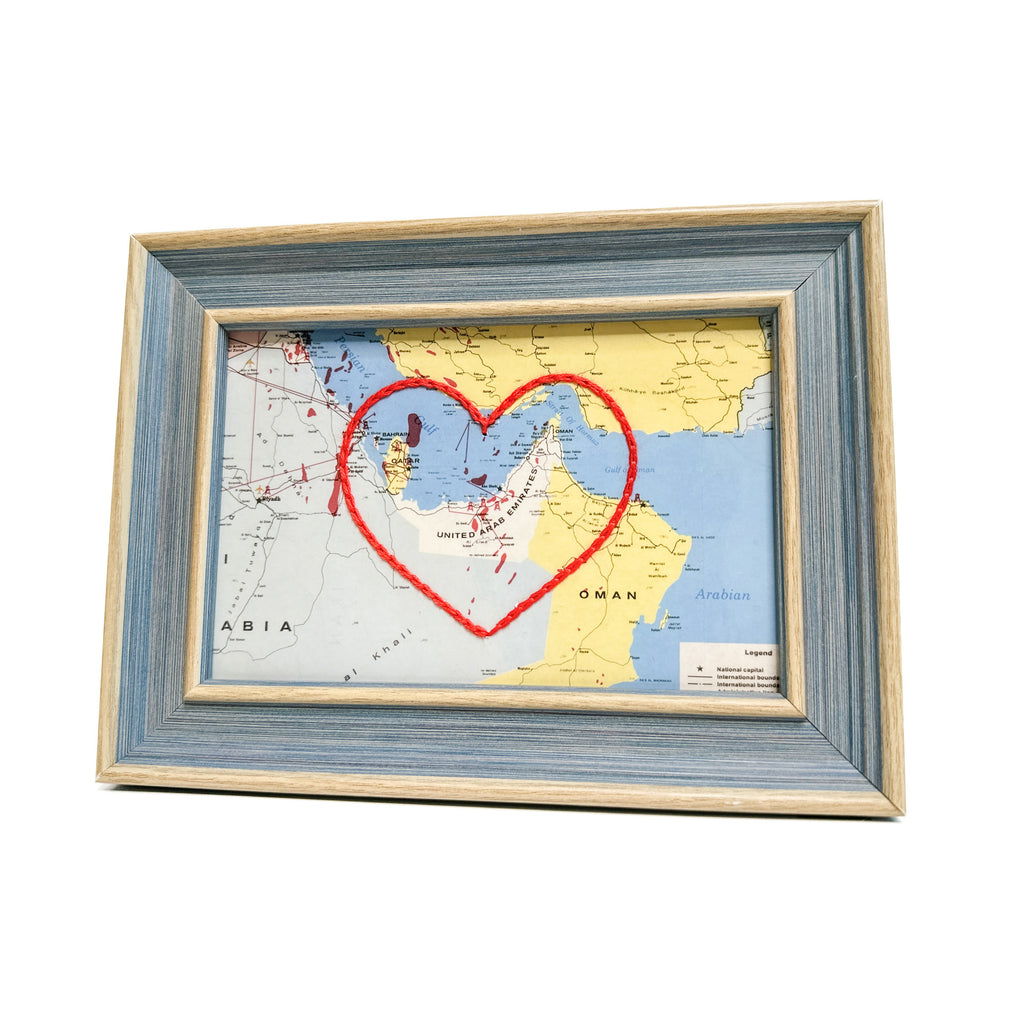 This vintage UAE map print has been hand-embroidered with a red heart that symbolizes the places, people, and adventures you hold dear.