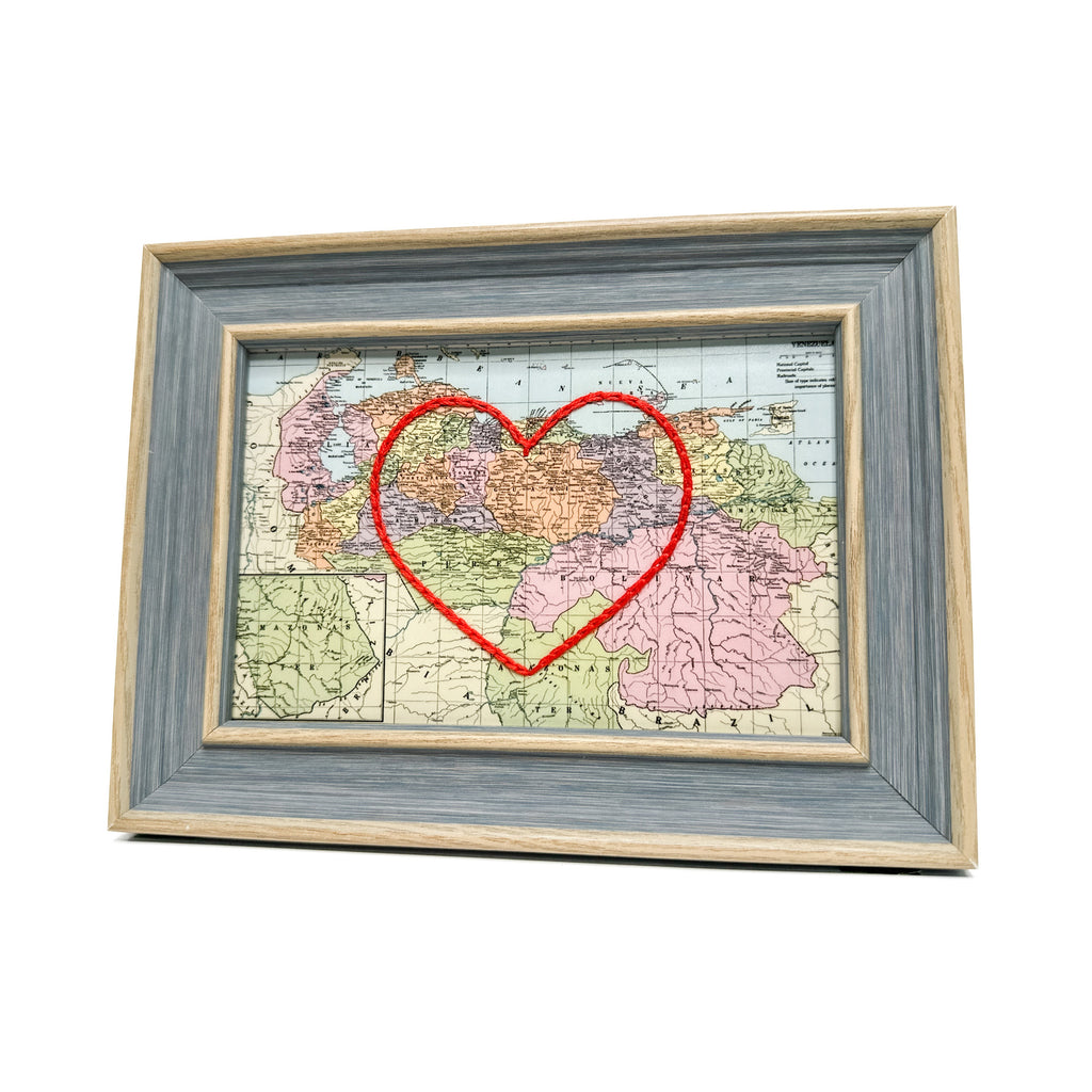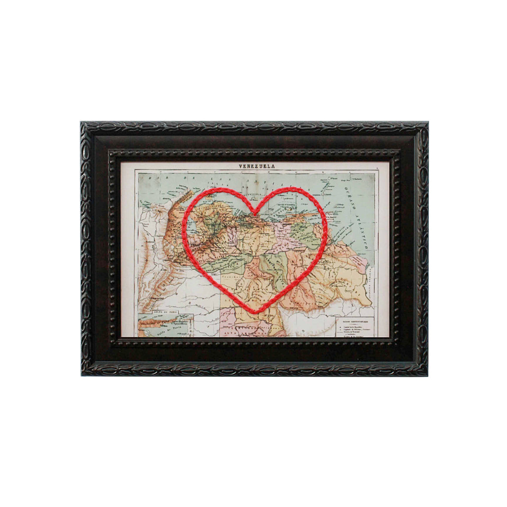 This vintage Venezuela map print has been hand-embroidered with a red heart - symbolizing the places, people, and adventures you hold dear.
