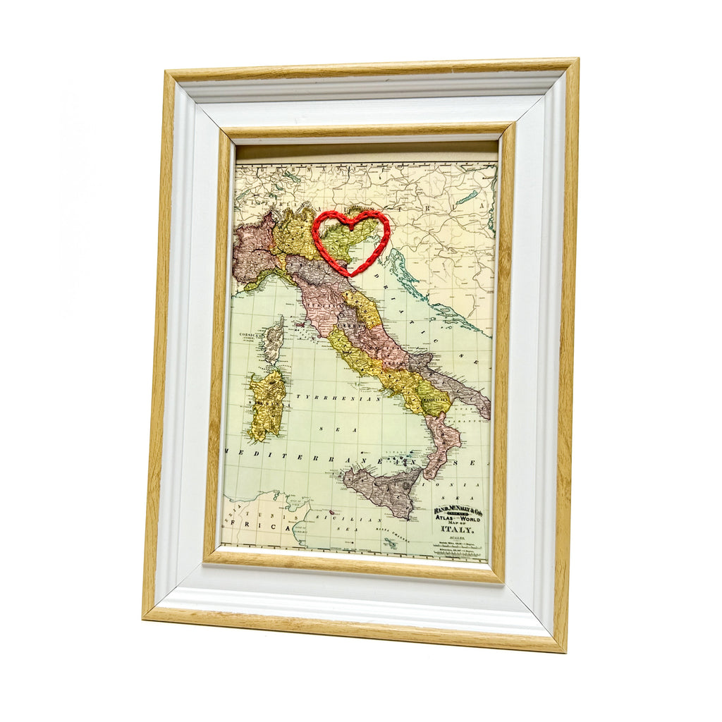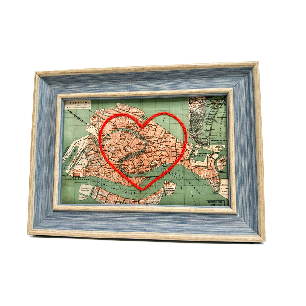 This vintage Venice, Italy map print has been hand-embroidered with a red heart - symbolizing the places, people, and adventures you hold dear.